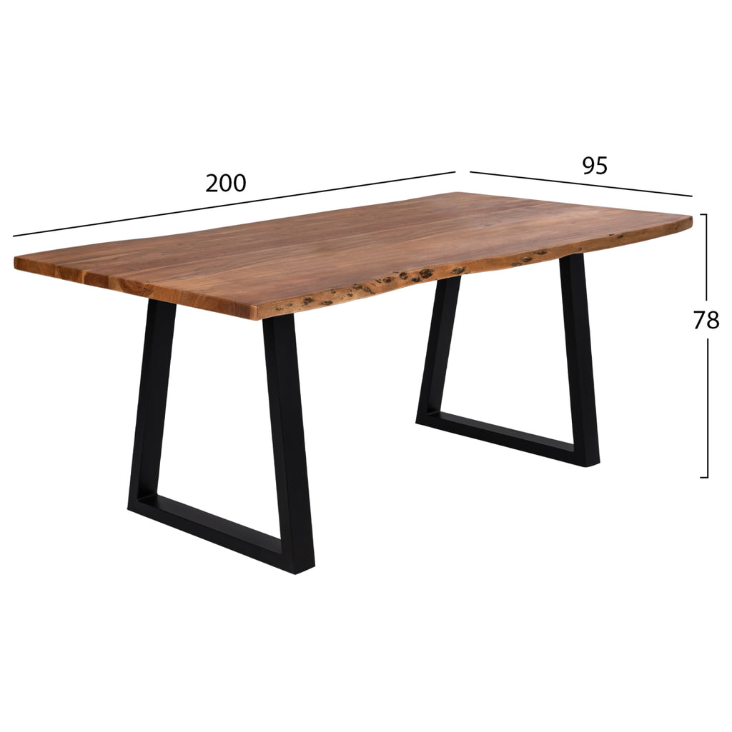 Ανακαλύψτε το μοναδικό χειροποίητο τραπέζι με τη φυσική μασίφ ξύλινη επιφάνεια ακακίας! Ως ιδιαίτερο χαρακτηριστικό, οι άκρες του τραπεζιού επεξεργάστηκαν για να δημιουργήσουν τον αρχικό χαρακτήρα και τη φυσική εντύπωση μιας φέτας από ένα τεράστιο δέντρο. Μην υποτιμάτε ποτέ την αξία ενός διαχρονικού σπιτιού, ανανεώστε την τραπεζαρία σας με μια παραδοσιακή εκδοχή που βρίσκει αξιόλογη θέση στο μοντέρνο design με μοναδικά έπιπλα εμπνευσμένα από την φύση. Το τραπέζι είναι κατασκευασμένο από μασίφ ξύλο ακακίας σε φυσική απόχρωση και μέταλλο σε μαύρο χρώμα. Συνδυάστε την με ένα ξύλινο παγκάκι ή μια καρέκλα με την ίδια αισθητική και αποκτήστε την τραπεζαρία που πάντα επιθυμούσατε. Η επιφάνεια του ξύλου έχει πάχος 4 εκ. Γενικές Διαστάσεις: 200x93x74 εκ.---*Οι διαστάσεις είναι ενδεικτικές. Μπορεί να υπάρχουν διαφορές στις διαστάσεις του προϊόντος λόγω των διαστάσεων του επεξεργασμένου ξύλου. Πάχος επιφάνειας: 4 εκ Απόσταση ποδιών: 154x85 εκ. Σημείωση: Το προϊόν είναι κατασκευασμένο από φυσικό μασίφ ξύλο ακακίας και κάθε ένα είναι μοναδικό λόγω της ανομοιομορφίας των κορμών των δένδρων. Οι υπάρχουσες ρωγμές ή αυτές που ενδέχεται να δημιουργηθούν με την πάροδο του χρόνου οφείλονται στην συστολή-διαστολή του ζωντανού οργανισμού που λέγεται μασίφ ξύλο, και δεν αποτελούν κατασκευαστικό ελλάτωμα, δίνοντας πρωτοτυπία και μοναδικό design στο χώρο σας. Κατά τη διαδικασία παραγωγής γίνεται ομοιομορφοποίηση και σταθεροποίηση των ρωγμών που υπάρχουν, με υλικό κατασκευασμένο από το ίδιο ξύλο. Επομένως, μπορεί να υπάρχουν χρωματικές παραλλαγές και διαφορές στις διαστάσεις του προϊόντος λόγω των διαστάσεων του επεξεργασμένου ξύλου. Αυτά δεν αποτελούν ελάττωμα του προϊόντος. Το προϊόν διατίθεται αμοντάριστο σε εργοστασιακή συσκευασία.