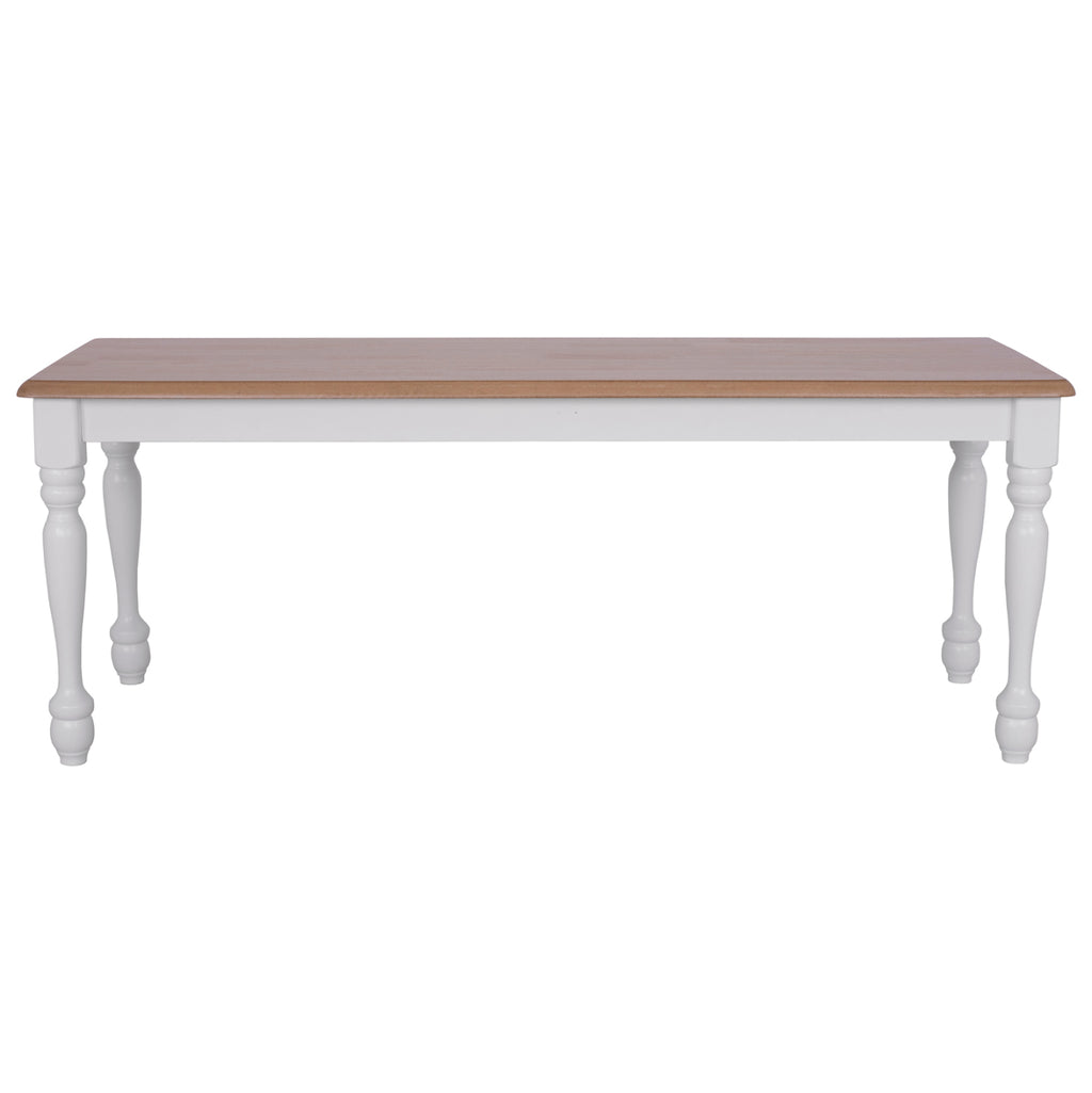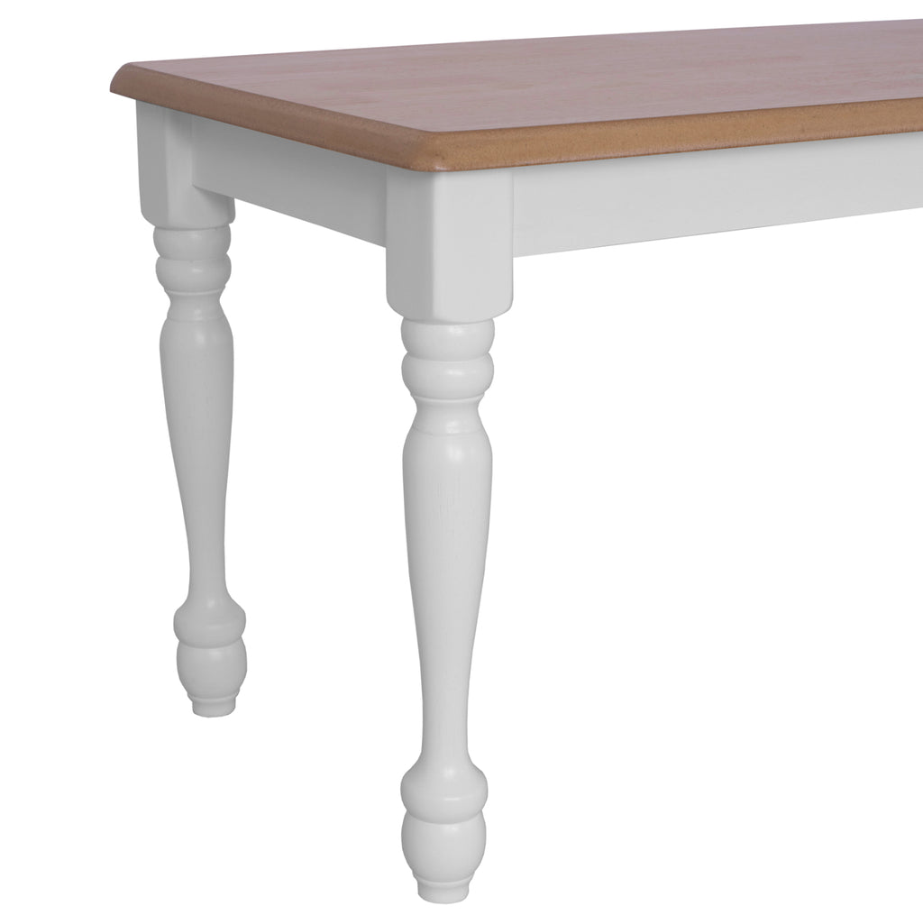 Дървена трапезна пейка ΜΜ8281, повърхността е мдф в цвят и вода в естественото дърво, а останалата част, рамката и краката са от дърво в бял нюанс. Размери: 120х40х46см.