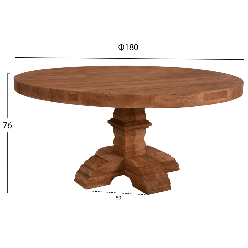 PROVENCE е кръгла трапезна маса (т.е. ротонда) за домашна и професионална употреба, с 8 см дебела дървена повърхност в естествен цвят. Цялата маса, както и колоната, която завършва на 4 фута, са от масивно дърво и са резбовани, придавайки провинциален стил. Кръглите маси са особено практични и красиви, защото нямат плотове и "водачи", нито ъгли или крака, които често създават неудобни ситуации. Тази ротонда е с големи размери, което я прави идеална за кътове за хранене. РАЗМЕРИ: Φ180 x 76H см. Дебелина на повърхността: 8см. Разстояние между краката: 80см. МАТЕРИАЛИ НА КОНСТРУКЦИЯТА: Масата е изцяло изработена от рециклирано масивно тиково дърво. Масивното дърво е вид дърво, чисто и неизбелено, традиционно използвано от дърводелците за направата на мебели. Масивната дървесина е най-скъпият избор по отношение на дървесината, но се откроява със своята вечна естетика. Ефектът, който предлага на притежателя си е наистина уникален. Тиковото дърво е най-популярният вид твърда дървесина. Той е жълт до тъмно кафяв на цвят, изключително тежък, с висока якост, устойчив на атмосферни влияния, устойчив на стружки и не се разлага. Често водите на дървото му са силни и прави. Използва се за много вътрешни и външни конструкции. ПОДДРЪЖКА: За поддръжка на ротондата е достатъчно почистване на прах на редовни интервали и минаване с мокра кърпа. За повърхността, разбира се, можете да използвате и леки почистващи препарати на пазара. ПРЕДИМСТВА: •Здрава и безопасна конструкция •Красив дизайн •Може да обслужва до 8 души •Идеален за трапезарията у дома, но също така и за професионални пространства, като ресторанти, хотели и банкетни зали като цяло. Продуктът се доставя без поръчка