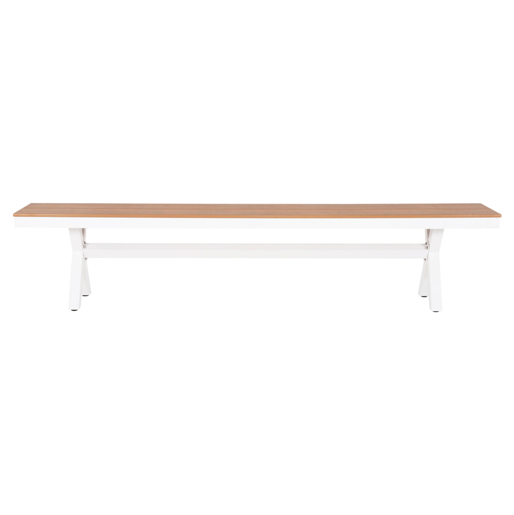 Външната пейка TAWNEE е стилно и практично решение за всяка градина, веранда, тераса или обществено пространство. Благодарение на изчистения си дизайн и висококачествените материали, тя съчетава удобство, устойчивост и модерен външен вид. Конструкцията ѝ включва бяла алуминиева рамка и седалка от две полидървесни плочи в цвят натурално дърво.