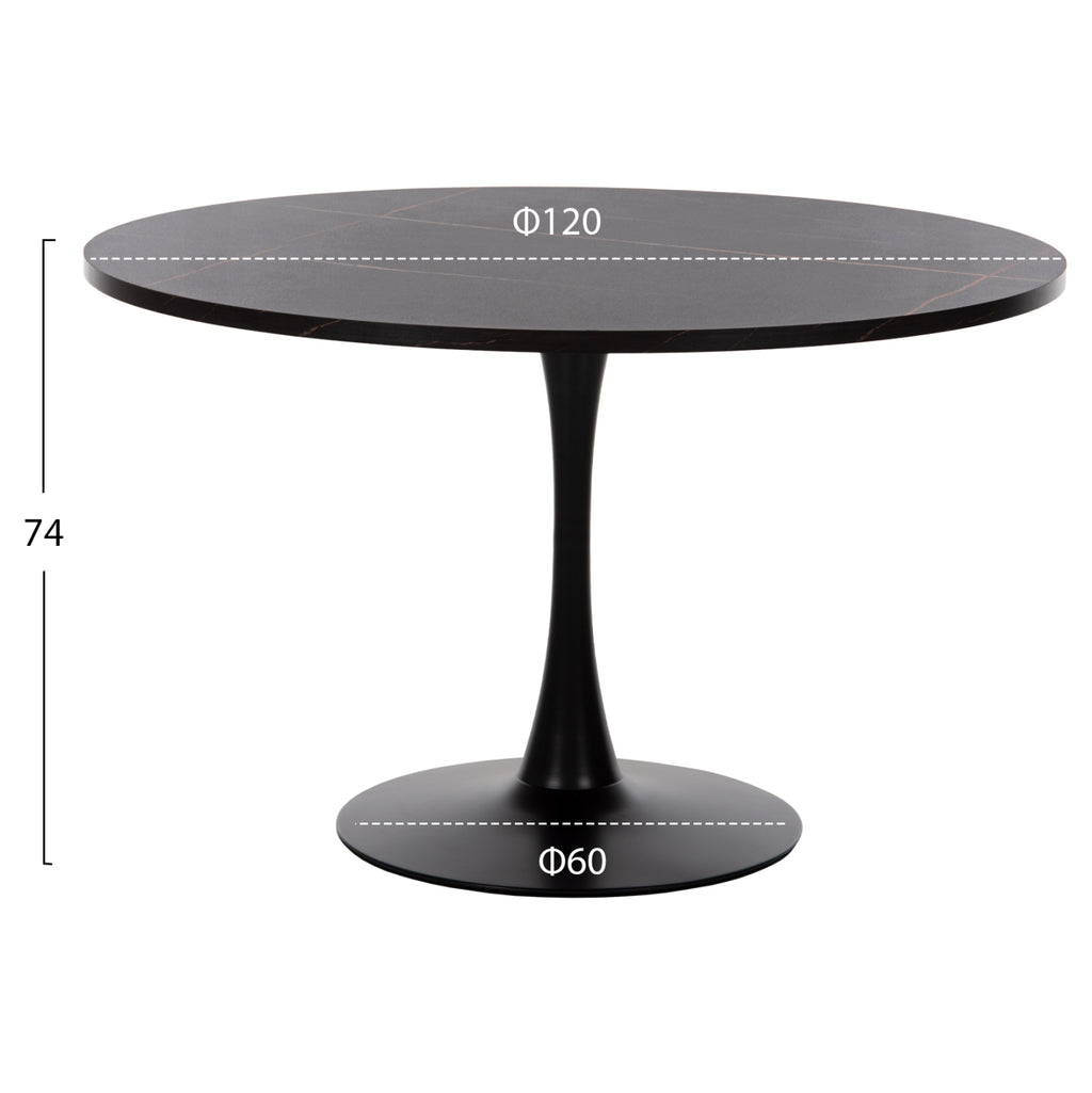 ΜΜ9422.02--Представяме ви модерна кръгла трапезна маса (т.е. ротонда), с меламинова повърхност в цвят ЧЕРЕН МРАМОР. Повърхността лежи върху метална ЧЕРНА цилиндрична колона, която има подходящите размери, за да поддържа адекватно масата. Кръглите маси са особено практични и красиви, защото нямат плотове и "водачи", нито ъгли или крака, които често създават неудобни ситуации. И накрая, тази ротонда е със задоволителен размер, което я прави отправна точка за вашата трапезария. РАЗМЕРИ: Φ120 X 74H cm Дебелина на повърхността: 2,5 cm Диаметър на кръгла подова основа: Φ60 cm. МАТЕРИАЛИ НА КОНСТРУКЦИЯТА: Носещата колона е метална, а повърхността е меламин с отлично качество. Меламинът е вид дървесина под формата на ПДЧ. ПДЧ са продукти, които имат формата на плоча (панел). Като материал е много издръжлив и с голяма твърдост. Така че това е синтетичен материал с много твърда повърхност, което го прави много устойчив на драскотини, абразия и петна. ПОДДРЪЖКА: За поддръжка на ротондата е достатъчно почистване на прах на редовни интервали и минаване с мокра кърпа. За повърхността, разбира се, можете да използвате и леки почистващи препарати на пазара. ПРЕДИМСТВА: •Стабилна и безопасна конструкция •Красив дизайн •Може да обслужва 5 души •Идеален за трапезарията у дома, но и за професионални пространства, като ресторанти, хотели и банкетни зали като цяло. Продуктът се доставя без поръчка