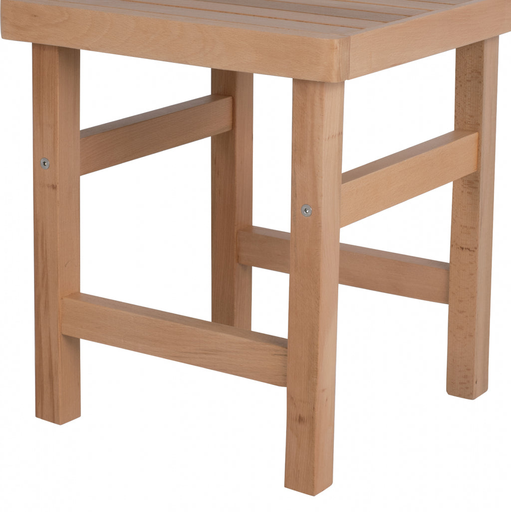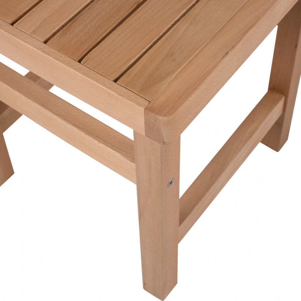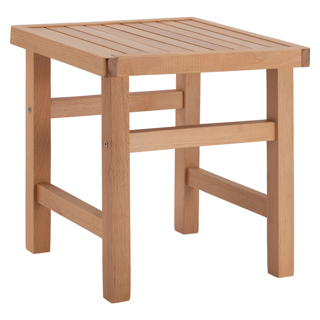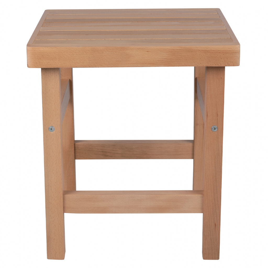 Стабилна настолна табуретка с подсилена конструкция от масивна букова дървесина. Подходяща за ниска масичка и за поставяне до шезлонг. Висококачествена рамка, специално обработена за голяма устойчивост на време и влага. Боядисване на продукта 1-ви етап: Един слой импрегниращ цвят. 2-ри етап: Слой италиански воден лак 3-ти етап: Повторете шлифоването. 4-ти етап: Един слой външен италиански воден лак за идеална издръжливост и естетически резултати на продукта. Цвят: Естествен. Размери: 40х40х45см. Разстояние между краката: 35х35 см. Височина на крака: 41 см. Подходящ за бизнес помещение. Произведено в Гърция Продуктът се изработва по поръчка и се доставя РЕЗАТОВАРЕН.