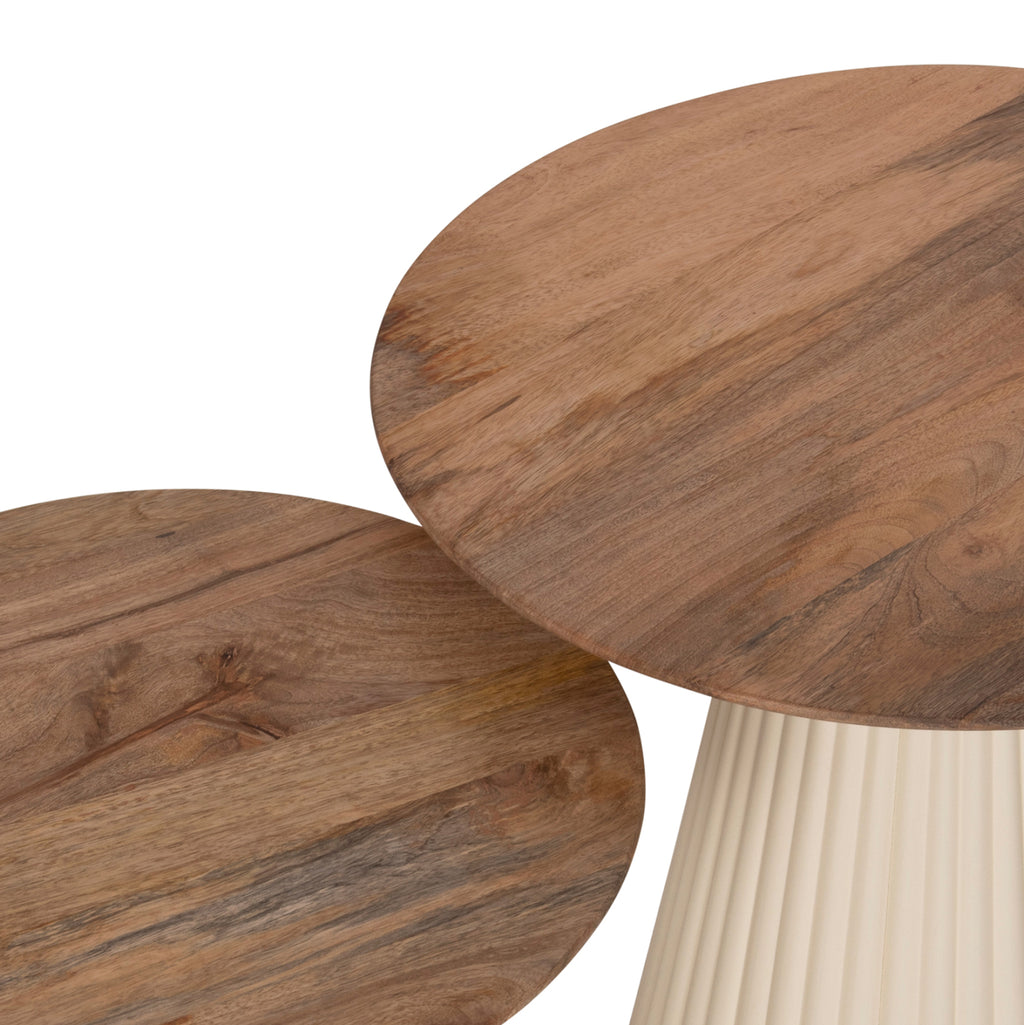 Комплектът холна маса FOLDY от 2 е още едно допълнение към нашата гама. Това са 2 холни маси с метална конична основа в ЧЕРЕН цвят, с красив стил. Повърхностите са кръгли от МАНГОВО дърво в неговия НАТУРАЛЕН цвят. Идеален както за дома, така и за бизнес помещения.