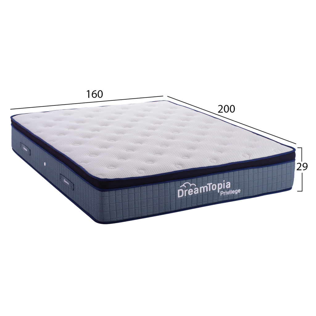 Представяме ви чисто новата колекция матраци DREAMTOPIA! Колекция, която създадохме, за да ви предложим най-доброто изживяване при сън, използвайки само най-добрите материали и разбира се, най-модерното в конструкцията на матраците. Серията PRIVILEGE е с ПРУЖИНИ С ДЖОБ и топ матрак EURO TOP, като същевременно се предлага с 5-годишна гаранция! В крайна сметка, матракът е средство за благополучие и релаксация. Човек със здравословен сън сменя позицията си на сън до шестдесет пъти на нощ (за да избегне мускулни и ставни болки). Възможността за промяна на позицията, без да бъде възпрепятстван, е предпоставка за освежаващ сън. Равномерното разпределение на налягането предотвратява болката в тялото там, където може да има най-голям натиск (рамене, бедра, пети) и гарантира добро кръвообращение. Отличната регулация на температурата (нито твърде горещо, нито твърде студено) и влажността (абсорбиране на потните течности) са перфектно адаптирани към индивида. Този конкретен матрак използва технологията на независимите пружини, която е може би най-популярният вид матрак с нова технология. Сърцето на матрака се състои от много независими пружини, обвити в цилиндрична джобна материя. Всяка пружина е плътно и равномерно подравнена със съседните пружини. Тази техника позволява на пружините да се движат независимо от съседите си. Тази сложна техника прави джобните матраци адаптивни към формата на тялото. Топ матракът EURO TOP нарича горната част на матрака или самия матрак „евро-топ матрак“. Но какво означава тази допълнителна повърхност на практика и какво предлага тя на тялото? Топ матракът Euro-Top допълва и подобрява уникалното усещане за сън, което матракът дава със своите луксозни дунапренени материали и ергономичен дизайн. В същото време той удължава живота на матрака, защото го предпазва от влага и износване, като същевременно увеличава неговата издръжливост и запазва формата му. Основната разлика при топовете за възглавници е, че топовете евро топ са съединени с шев по периметъра на основното тяло на матрака, придавайки лек наклон към краищата на матрака, и нямат „квадратен“ вид или вид на самостоятелно парче върху матрака. По същество това е едно и също нещо, с разликата в сглобяването на топ матрака върху матрака. ТЕХНИЧЕСКИ СПЕЦИФИКАЦИИ: Размери: 160x200 см. Височина на матрака: 29 см. • Джобни пружини 260 бр./м², с височина на пружината 20 см • 1 лист FELTRON 1200 гр. от всяка страна • Периметърна опора от пяна ГОРНА СТРАНА • 1 лист мека пяна 2 см от горната страна • 1 лист ергономична пяна 4 см от горната страна • 1 лист мека пяна 1 см от горната страна • Дакронова вата 200 гр. от горната страна • Плетена материя от горната страна ДОЛНА СТРАНА • 1 лист мека пяна 1 см от долната страна • 1 лист дакронова вата 200 гр. от долната страна • Плат Zaker от долната страна ТВЪРДОСТ: 3/5 („5“ е най-твърдата) МАТЕРИАЛИ ЗА КОНСТРУКЦИЯ: За по-добро разбиране на техническите характеристики на матрака, ви предоставяме някои подробности, за да разберете качеството на неговата изработка. Горната повърхност на матрака е изработена от плетена материя, докато долната повърхност е изработена от плат Zakar. Жакардът е по същество вид (техника) на плетене. Меката пяна, която присъства от двете страни, е мек дунапренен материал, докато ERGO FOAM е пяна, гъвкава и хипоалергенна с голяма издръжливост. Тя има анат