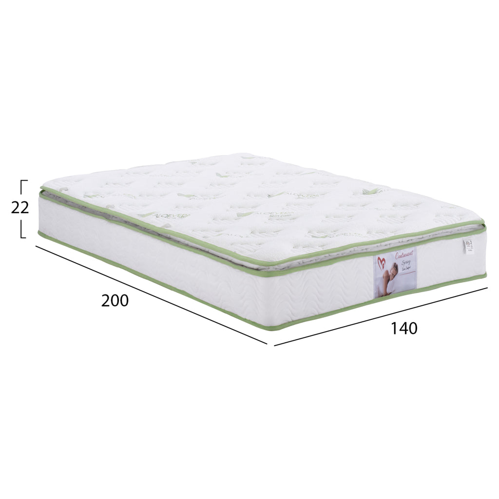 Матрак с непрекъснати пружини (бонел) в двуслоен и еднолицев размер, с интегрирана горна част на възглавницата с АЛОЕ ВЕРА. Матракът е средство за благополучие и релакс. Спящият здрав сменя позицията си на сън до шестдесет пъти на нощ (за да избегне болки в мускулите и ставите). Умението безпрепятствено да променя позицията си е необходимо условие за възстановителен сън. Равномерното разпределение на натиска предотвратява болката в тялото, където може да има най-голям натиск (рамене, бедра, пети) и гарантира добро кръвообращение. Отличното регулиране на температурата (нито прекалено горещо, нито твърде студено) и влажността (абсорбиране на потта) са идеално адаптирани към индивида. Но най-важното нещо, което трябва да запомните е, че степента на твърдост на матрака трябва да се регулира според вашите лични предпочитания. Ето защо различните скали на твърдост, които са в обращение, не отразяват в абсолютна степен вашата собствена реалност. Този конкретен матрак е направен с традиционната и по-издръжлива конструкция на матрака. Те се състоят от множество пружини от един и същи тип и твърдост, свързани в решетка. Тази мрежа е сърцето на матрака и отговаря за това как ще се разпредели тежестта. Матраците Bonnell обикновено са по-твърди от матраците с независими покет пружини и дунапреновите матраци. Горната част на възглавницата се отнася до горната част на матрака или самия матрак като „горна възглавница“. Но какво на практика означава тази допълнителна повърхност и какво предлага на тялото? По същество горната част на възглавницата е повърхностен слой от мек материал, който е зашит и опакован в калъфа. Това осигурява меко усещане за "облак" на повърхността на матрака. Горните части на възглавниците започнаха като горни части за матраци (и тънки матраци или подложки за матраци), които се нанасяха върху матрак като допълнителна подплата. След това започнаха да се адаптират като нормални повърхности на матраци, докато днес могат да придружават почти всеки матрак с или без пружини. Какви са предимствата на горната част на възглавницата? Топ матракът е по-мек и плюшен по отношение на усещането, което оставя върху тялото. При повечето модели те са по-меки от матрака и в почти всички случаи допринасят за височината на матрака. ТЕХНИЧЕСКИ ХАРАКТЕРИСТИКИ: (за повече подробности вижте съответната снимка) Размери: 140х200см. Височина на матрака: 22 см. - Плат (плетено)------------------------------ - Дунапрен -------------------------------------------------- - 3,5см. вълнообразна пяна.----------Ватирана - Нетъкан текстил------------------ горна част на възглавницата - 3см дунапрен--------------------------- - Нетъкан текстил----------------------- - 700гр Памучна вата - 700гр Памучна вата -17см. непрекъсната височина на пружината - Твърда вата - Нетъкан текстил - Брой пружини: 14x37 пружини - Общ брой пружини: 518 МАТЕРИАЛИ НА КОНСТРУКЦИЯТА: Повърхността на матрака е изработена от тъкана тъкан от кактусови влакна от алое вера, която има милиони микроклетки, които при контакт с кожата се пукат, освобождавайки своите лечебни съставки от растението Алое Вера и имат благоприятен ефект по време на сън. След това има слой пяна. Вътрешността на матрака се състои от дунапрен с висока плътност във вълнообразен дизайн, така че да поддържа разстоянията между другите материали, като същевременно осигурява тяхната правилна вентилация. Под това има 