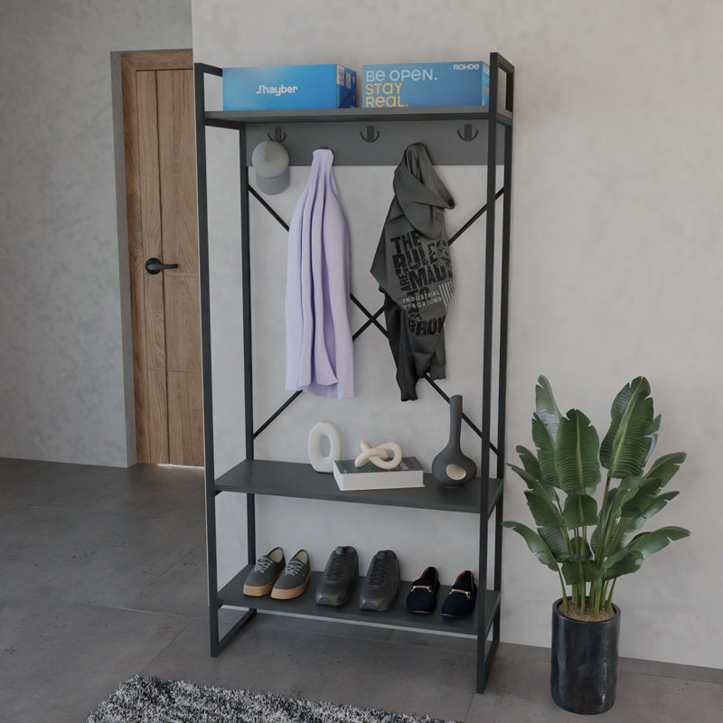 С модерния модул за антре Levento можете да превърнете входното си антре в пространство, което е едновременно красиво и функционално. Проектирана да отговори на всички ваши ежедневни нужди, тази мебел предлага цялостно решение за съхранение. Закачете палта, шалове и чанти на вградените куки, подредете спретнато обувките си на долния рафт и използвайте горните рафтове, за да добавите личен щрих с декоративни предмети или книги. Технически характеристики: Изработена от висококачествено ПДЧ с меламин антрацитно покритие. Поддържана от издръжлива черна метална рамка за здравина и стабилност. Разполага със закачалка за дрехи и рафтове за обувки, аксесоари, чанти и декоративни дисплеи. Размери на продукта: Дължина: 88 см Ширина: 34 см Височина: 180 см Информация за материала: ПДЧ: Композитен дървесен материал, изработен от малки дървесни частици, обикновено бор или ела, свързани под високо налягане и температура със смоли. Често използван в мебели, интериорни повърхности и строителни приложения. Изработен от рециклирани материали и устойчив на деформация, ожулвания и други натоварвания. Меламин (LPB): Синтетичен материал, широко използван като повърхностна обработка на ПДЧ в производството на мебели, поради своята издръжливост и лесна поддръжка. Прилага се върху основи като MDF или OSB шперплат за създаване на устойчиви повърхности. Метал: Широко използван в производството на мебели, предлагащ изключителна издръжливост и устойчивост на износване. Идеален за ежедневна употреба в тежки среди, осигурявайки стабилност и дълготрайност. Някои метали могат да имат и специални свойства, като антимикробни ефекти (мед) или свръхпроводимост (молибден). Инструкции за поддръжка: ПДЧ: Почиствайте с мека кърпа, леко навлажнена с вода и мек препарат. Избягвайте прекомерно количество вода и поддържайте повърхността суха след това. Меламин (LPB): Отстранете петната с мека кърпа, леко навлажнена с вода и мек сапун. Избършете внимателно, докато петното изчезне. Тъй като меламинът е чувствителен към влага, предпазвайте го от прекомерна вода. Метал: За метал на закрито се препоръчва редовно почистване от прах или избърсване с влажна кърпа. Забележки: Продуктът се доставя несглобен във фабрична опаковка с подробно ръководство за монтаж. Цветът на продукта може леко да се различава от фотографското му представяне на вашия екран.
