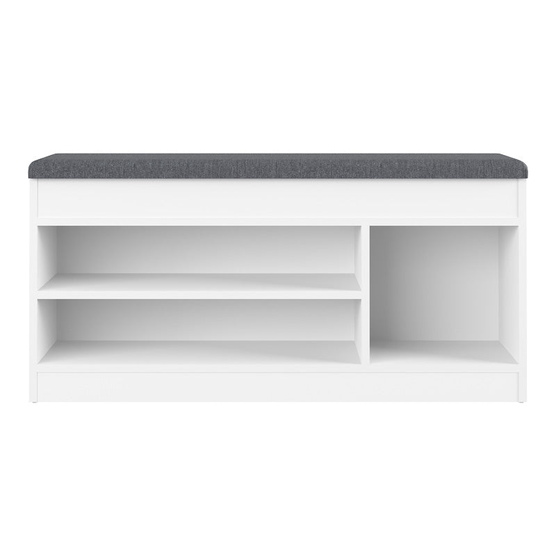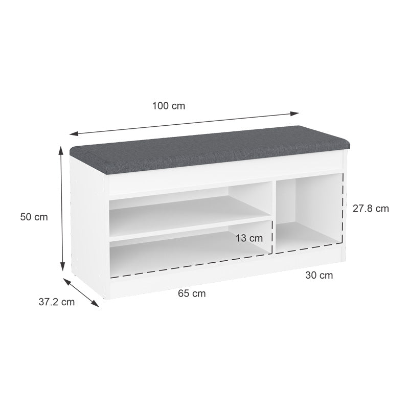 Мебели за антре / Шкаф за обувки с вградена седалка Изключително функционална и визуално привлекателна мебел, идеална за входове, коридори или дори спални. Той умело съчетава нуждите от съхранение на обувки с практичността на удобна зона за сядане. Неговият минималистичен и практичен дизайн го прави идеален за пространства, които изискват интелигентни организационни решения без компромис със стила. Това е отличен избор за поддържане на входа на вашия дом подреден, като същевременно предлага комфорт и функционалност. Технически характеристики: Рамка от ПДЧ с дебелина 16 мм с висококачествено меламиново покритие, предлагащо устойчивост на натоварване, износване и време. Предлага се в бял цвят. Хармоничното цветово съчетание подобрява цялостния естетичен резултат. Размери на продукта: Дължина: 100 см Ширина: 37,2 см Височина: 50 см Забележки: Продуктът се доставя опакован във фабрична опаковка с подробно ръководство за монтаж. Цветовият тон на продукта може леко да се различава от това, което се показва на вашия екран.