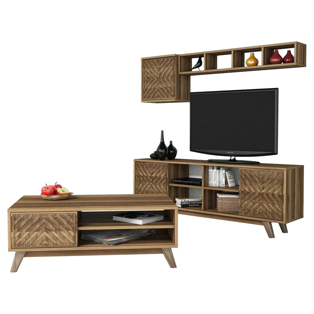 Композицията ΜΜ11853.01 ще промени облика на вашата всекидневна и ще ви предложи подобрението, което желаете. Състои се от комбинация от мебели за вашия телевизор с подов модул, стенен рафт и стенен шкаф и масичка за кафе. Характерно за цялата композиция са множеството зони за съхранение и поставяне на предмети. Цялата композиция е от същата серия, като доминиращият цвят е ОРЕХ. РАЗМЕРИ: ТВ КОМБИНАЦИЯ: ОСНОВНО ОБЗАВЕЖДАНЕ: Дължина: 160см. Височина: 56,2 см. Дълбочина: 35 см. СТЕНЕН РАФТ: Дължина: 117,6см. Височина: 18,6 см. Дълбочина: 20см. СТЕНЕН ШКАФ: Дължина: 42.4см. Височина: 42,4 см. Дълбочина: 25 см. МАСА: 105x60x38.2H см. Дебелина на меламина: 18 мм. (1,8 см) МАТЕРИАЛИ НА ИЗРАБОТКА: Цялата композиция е изработена от висококачествен меламин. Меламинът е вид дървесина под формата на ПДЧ. Като материал е много устойчив на драскотини, протриване и петна. ПОДДРЪЖКА: Меламинът се почиства много лесно от петна благодарение на твърдата си повърхност. Можете да избършете всички повърхности с влажна кърпа и това е достатъчно. За упорити петна можете да използвате мек почистващ препарат. КОМПОЗИЦИЯТА СЕ ПРЕДЛАГА ПО ЕДИНСТВЕНО ВЪВ ФАБРИЧНАТА ОПАКОВКА