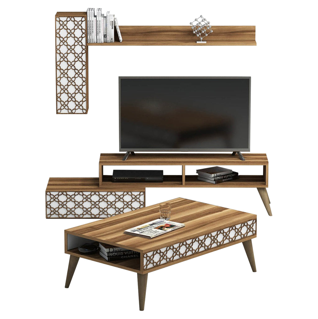 Композицията ΜΜ11850.03 ще промени облика на вашия хол и ще ви предложи подобрението, което желаете. Състои се от комбинация от мебели за вашия телевизор с подов модул, стенен рафт и стенен шкаф и масичка за кафе. Цялата композиция е от същата серия с цветова комбинация ОРЕХ и БЯЛО. РАЗМЕРИ: ТВ КОМБИНАЦИЯ: ОСНОВНО ОБЗАВЕЖДАНЕ: Дължина: 150см. Височина: 37,8 см. Дълбочина: 37,2 см. ПОДОВ ШКАФ: Дължина: 70см. ---- Дълбочина: 37,2 см. СТЕНЕН РАФТ: Дължина: 120см. Височина: 11,8 см. Дълбочина: 16,1см. СТЕНЕН ШКАФ: Дължина: 20см. Височина: 70 см. Дълбочина: 22см. МАСА МАСА: Размери на масата: 105x60x36.6 см. Дебелина на меламина: 18 мм. (1,8 см) МАТЕРИАЛИ НА ИЗРАБОТКА: Цялата композиция е изработена от висококачествен меламин. Меламинът е вид дървесина под формата на ПДЧ. Като материал е много устойчив на драскотини, протриване и петна. ПОДДРЪЖКА: Меламинът се почиства много лесно от петна благодарение на твърдата си повърхност. Можете да избършете всички повърхности с влажна кърпа и това е достатъчно. За упорити петна можете да използвате мек почистващ препарат. КОМПОЗИЦИЯТА СЕ ПРЕДЛАГА ПО ЕДИНСТВЕНО ВЪВ ФАБРИЧНАТА ОПАКОВКА