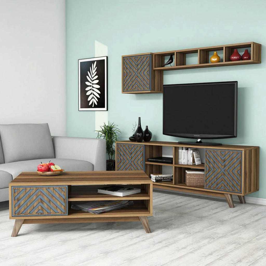 Композицията ΜΜ11853.02 ще промени облика на вашата всекидневна и ще ви предложи подобрението, което желаете. Състои се от комбинация от мебели за вашия телевизор с подов модул, стенен рафт и стенен шкаф и масичка за кафе. Характерно за цялата композиция са множеството зони за съхранение и поставяне на предмети. Цялата композиция е от същата серия, като доминиращите цветове са ОРЕХ и СИНЬО. РАЗМЕРИ: ТВ КОМБИНАЦИЯ: ОСНОВНО ОБЗАВЕЖДАНЕ: Дължина: 160см. Височина: 56,2 см. Дълбочина: 35 см. СТЕНЕН РАФТ: Дължина: 117,6см. Височина: 18,6 см. Дълбочина: 20см. СТЕНЕН ШКАФ: Дължина: 42.4см. Височина: 42,4 см. Дълбочина: 25 см. МАСА: 105x60x38.2H см. Дебелина на меламина: 18 мм. (1,8 см) МАТЕРИАЛИ НА ИЗРАБОТКА: Цялата композиция е изработена от висококачествен меламин. Меламинът е вид дървесина под формата на ПДЧ. Като материал е много устойчив на драскотини, протриване и петна. ПОДДРЪЖКА: Меламинът се почиства много лесно от петна благодарение на твърдата си повърхност. Можете да избършете всички повърхности с влажна кърпа и това е достатъчно. За упорити петна можете да използвате мек почистващ препарат. КОМПОЗИЦИЯТА СЕ ПРЕДЛАГА ПО ЕДИНСТВЕНО ВЪВ ФАБРИЧНАТА ОПАКОВКА