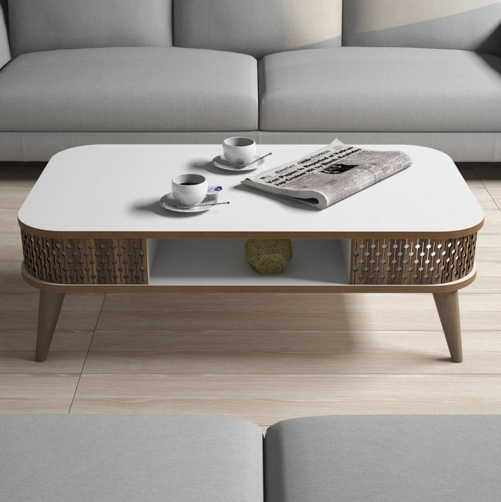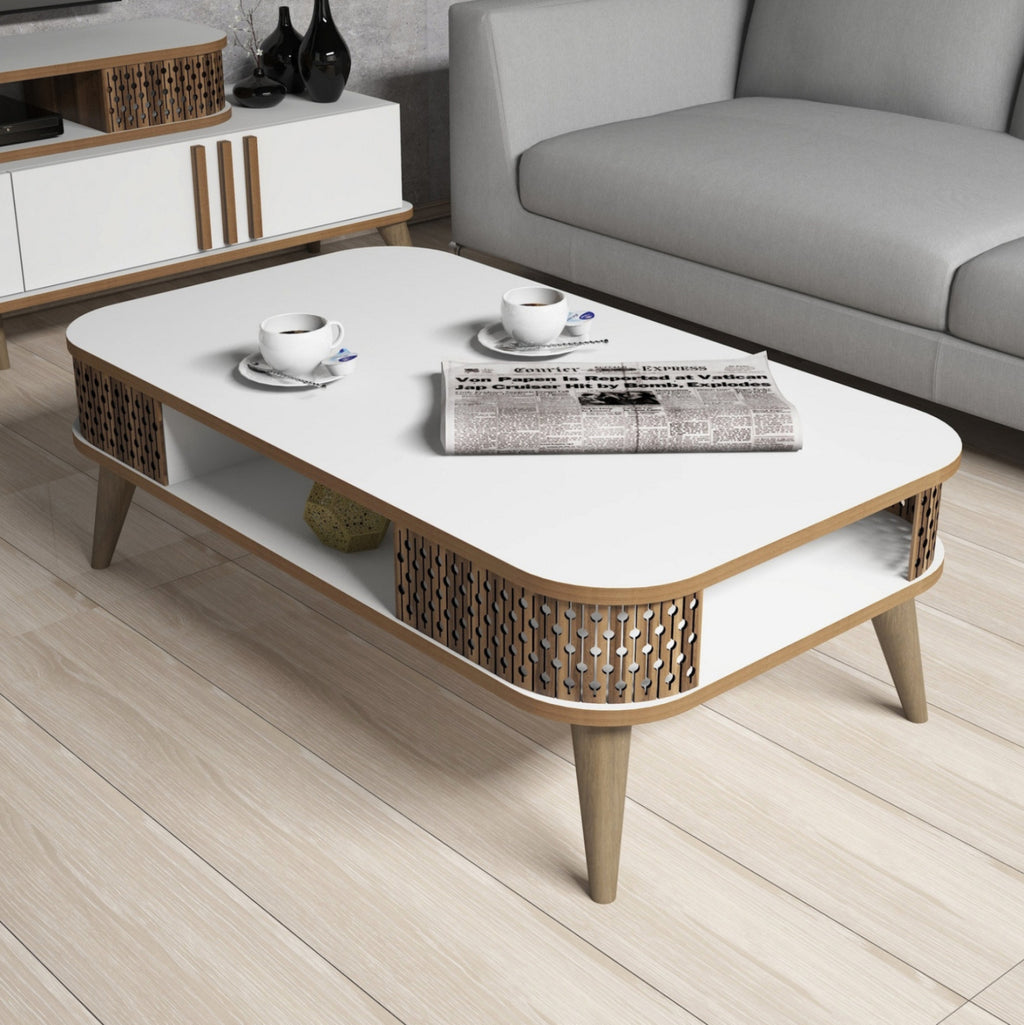 Тази холна маса е красива мебел в БЯЛ цвят. Красивият ѝ дизайн ще промени визията на вашата всекидневна или хол към по-добро. Тя е конструкция с достатъчно голяма горна повърхност. Отдолу има 3 отворени пространства за поставяне на предмети. Характерното за тази холна маса обаче е, че ъглите ѝ са заоблени, а извивките са направени с перфориран модел от меламин в цвят ОРЕХ. Елегантност, качество и минималистичен дизайн характеризират тази холна маса, която е изработена за вас.