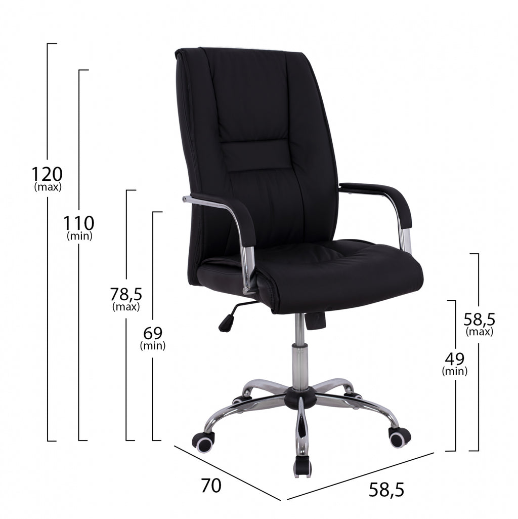 Облегалката и седалката са анатомично подплатени с дунапрен, осигурявайки комфорт и подкрепа при продължителна употреба. Хромираната метална основа тип „звезда“ с извити крачета придава допълнителна стабилност и е устойчивa на натоварване до 120 кг. Колелцата са полиуретанови, осигуряват тихо и плавно движение, като същевременно предпазват подовите настилки от надраскване.
