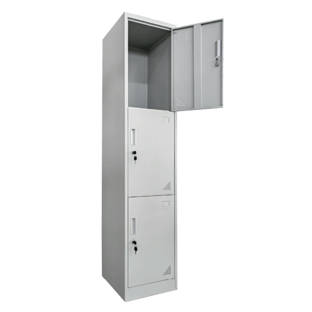 BELFAST е метален единичен багажник с три вертикално разположени шкафчета, които се заключват с ключ. Насочена е основно към професионални пространства, които имат нужда от подобна мебел. Всяка жабка има едно място за съхранение, докато вратите също имат решетки за вентилация. Цветът е СВЕТЛО СИВ. РАЗМЕРИ: 38.5x45x185H см. МАТЕРИАЛИ НА КОНСТРУКЦИЯТА: Носилката е метална с електростатично боядисване. Електростатичното боядисване е процес на сухо покритие, използван като метално покритие. Електростатичното боядисване е нанасяне на сух прах чрез електростатичен процес, който след това се „свързва“ към метала чрез топлина. ПОДДРЪЖКА: Можете да избършете всички повърхности с влажна кърпа, а ако има упорити петна, можете да използвате мек почистващ препарат. Забележки: - Продуктът се доставя разглобен във фабрична опаковка, с подробна инструкция за сглобяване. - Цветопредаването на продукта може леко да се различава от неговото фотографско представяне на вашия екран.
