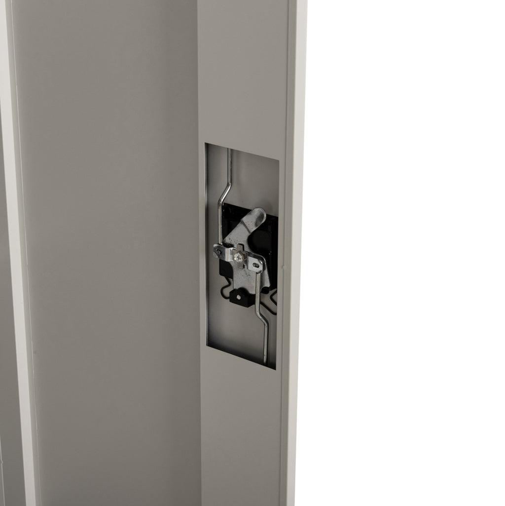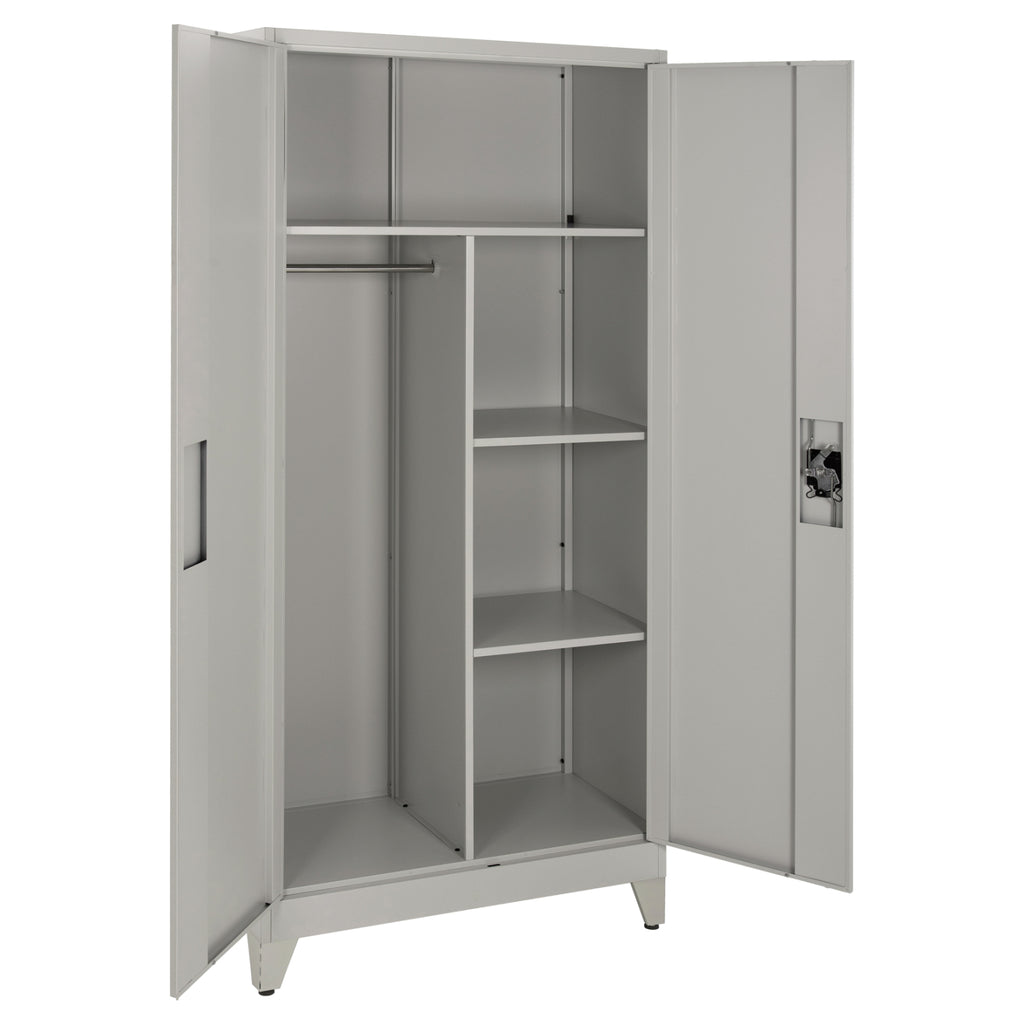 CLOD е практичен метален гардероб с крака, създаден с мисъл за капацитет и издръжливост. Тя е двукрила, като двете врати се затварят точно в средата на конструкцията, а интериорът е разделен на 3 основни зони с Т-образна метална преграда. Горната част е единична като детско креватче, докато едната страна има метален прът за окачване на предмети, а другата има 2 рафта, които създават 3 нива за съхранение. Вратите са с ключалка, която се заключва с ключ, а цветът на гардероба е много светло сив. РАЗМЕРИ: 90x44x190H см. Височина на крака: 10 см. МАТЕРИАЛИ НА ИЗРАБОТКА: Гардеробът е метален с електростатично боядисване. Електростатичното боядисване е процес на сухо покритие, използван като метално покритие. Електростатичното боядисване е нанасяне на сух прах чрез електростатичен процес, който след това се „свързва“ към метала чрез топлина. ПОДДРЪЖКА: Можете да избършете всички повърхности с влажна кърпа, а ако има упорити петна, можете да използвате мек почистващ препарат. ПРЕДИМСТВА: •Здрава конструкция •Голяма вместимост •Задоволителни размери •Съчетава качество на конструкцията с ергономичност •Съотношение цена/качество Забележки: Продуктът се доставя разглобен във фабрична опаковка, с подробна инструкция за монтаж.