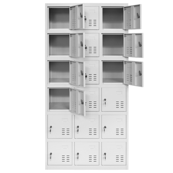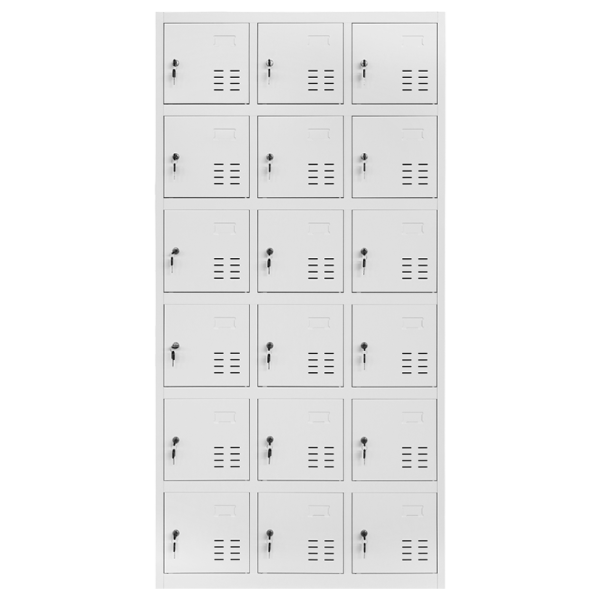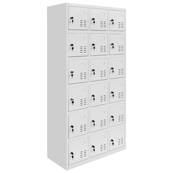 Метален шкаф Carmen CR-1261 ZHZ разполага с 18 индивидуални врати, всяка със собствено заключване с ключ. Подходящ е за съхранение на лични вещи в офиси, спортни зали, училища или съблекални. Конструкцията е компактна и стабилна, с вентилационни отвори за проветрение във всяко отделение.