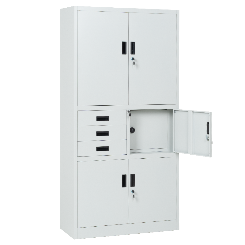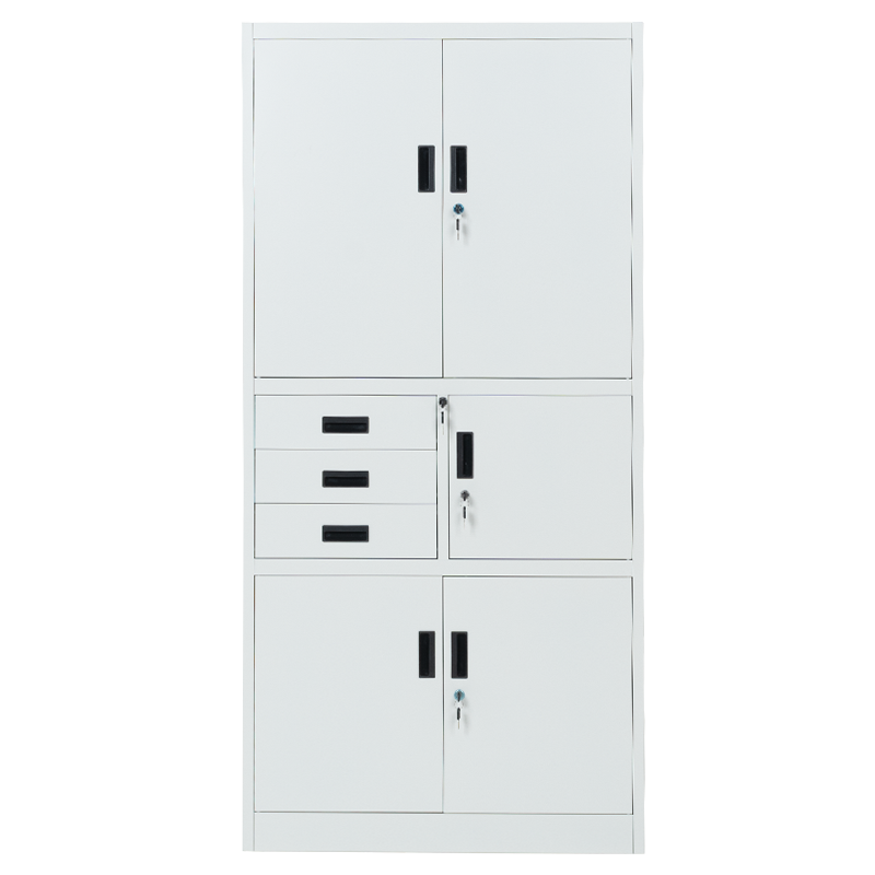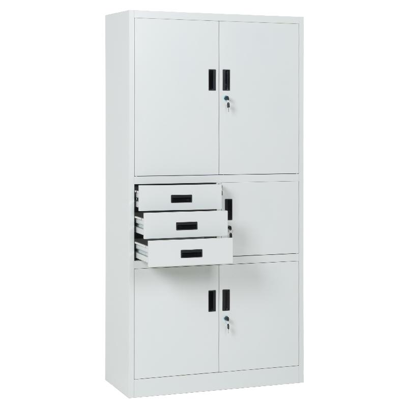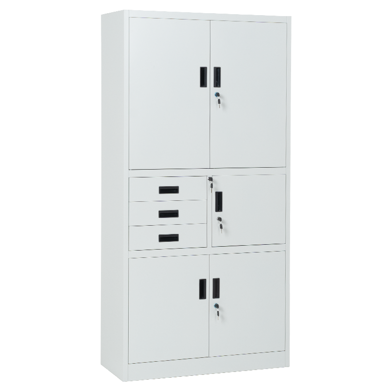 Carmen CR-1281 E K е метален шкаф за документи с удобно разпределение от две отделни шкафчета, 3 чекмеджета с общо заключване и 1 сейф. Всяко шкафче разполага с един рафт с регулируема височина и плътни врати със заключване. Пълна информация за размерите и характеристиките на модела ще намерите в таблицата в таб/поле "Техническа информация".