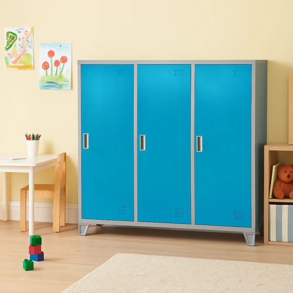 Метален шкаф Carmen CR-1605-3 JZ е троен метален гардероб с три плътни врати, които се затварят с помощта на магнитна система. Всяко отделение разполага с рафт с товароносимост до 40 кг, вграден лост за закачалки и вентилационен отвор за добра циркулация на въздуха. Моделът е снабден с крака с височина 10 см, които улесняват почистването под шкафа. Изработен е от праховобоядисан метал с грапаво-шагрен покритие. Подходящ е за оборудване на детски градини.