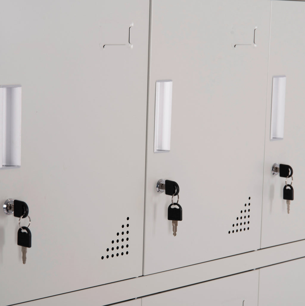 BEXLEY е метална количка с 12 шкафчета, които се заключват с ключ. Насочена е основно към професионални пространства, които имат нужда от подобна мебел. Всяка жабка има едно място за съхранение, докато вратите също имат решетки за вентилация. Цветът е СВЕТЛО СИВ. РАЗМЕРИ: 90x45x185H см. Размери на шкафа: 31.5x42.5x43.5H см. МАТЕРИАЛИ НА КОНСТРУКЦИЯТА: Носилката е метална с електростатично боядисване. Електростатичното боядисване е процес на сухо покритие, използван като метално покритие. Електростатичното боядисване е нанасяне на сух прах чрез електростатичен процес, който след това се „свързва“ към метала чрез топлина. ПОДДРЪЖКА: Можете да избършете всички повърхности с влажна кърпа, а ако има упорити петна, можете да използвате мек почистващ препарат. Забележки: - Продуктът се доставя разглобен във фабрична опаковка, с подробна инструкция за сглобяване. - Цветопредаването на продукта може леко да се различава от неговото фотографско представяне на вашия екран.