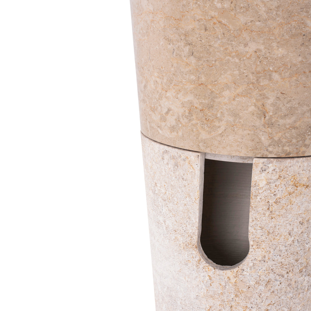 Мивката KG7808.02 е модерен елемент от обзавеждането за баня. Тя е изработена от мрамор, издълбан в конична форма и специално оформен като мивка/умивалник за баня. Тя следва тенденцията в декорацията, която изисква естествени и устойчиви материали във всяка част на дома, но също така и във всяко професионално пространство, като хотели, Airbnb, кетъринг зони и др. С двуцветното си БЯЛО и КРЕМАВО покритие, тя естетически ще се съчетае с повечето декоративни мотиви и с право ще привлече всички погледи. ТЕХНИЧЕСКИ ХАРАКТЕРИСТИКИ: Размери: Φ40x90H см. МАТЕРИАЛ НА ИЗРАБОТКАТА: Тази мивка е изработена от мрамор. ПОДДРЪЖКА: Препоръчителният метод за почистване на мраморни повърхности е с гореща вода. Поради порестата си повърхност, мраморът лесно се оцветява от различни киселини. В такива случаи се препоръчва бързо почистване с топла вода и кърпа или гъба. Препарати с неутрално pH (над 5) могат да се използват много пестеливо като част от почистващия разтвор. Трябва да се избягват потребителски почистващи продукти.