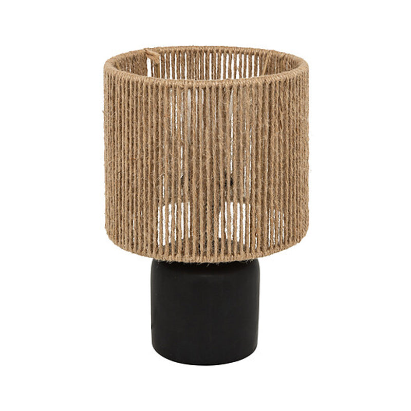 Осветете пространството си с топъл, естествен блясък и добавете нотка бохемски шик с тази красива настолна лампа. Компактната ѝ, минималистична основа е перфектно допълнена от цилиндричния абажур, сложно обвит с въже за занаятчийски завършек. Технически характеристики: • Изработена от високоиздръжлив керамичен материал. • Абажур, изработен от въже в естествен цвят с високо естетическо качество. • Предлага се в черно покритие. Размери на продукта: • Дължина: 16 см • Ширина: 16 см • Височина: 24 см Забележки: • Продуктът се доставя във фабрична опаковка. • Цветът на продукта може леко да се различава от фотографското му изображение на вашия екран.