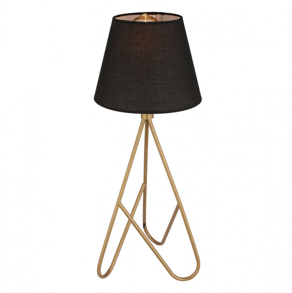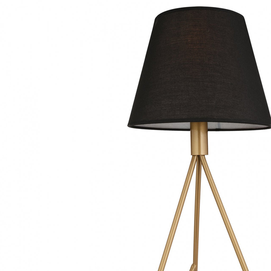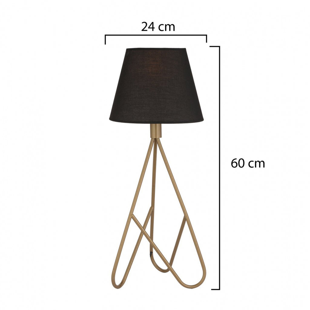 Настолна лампа, в черен и златист цвят. Лампа с изключително качество, с подчертан дизайн, оригинален и елегантен стил, за обновяване на декорацията на вашето лично пространство. Изработена от метална рамка, изключително издръжлива. Приема крушка E27, която не е включена. Максимум 60 вата. Има възможност за използване на LED лампи. Размери: 24х60Н см. Европейско производство и произход. Продуктът се предлага във фабрична опаковка.