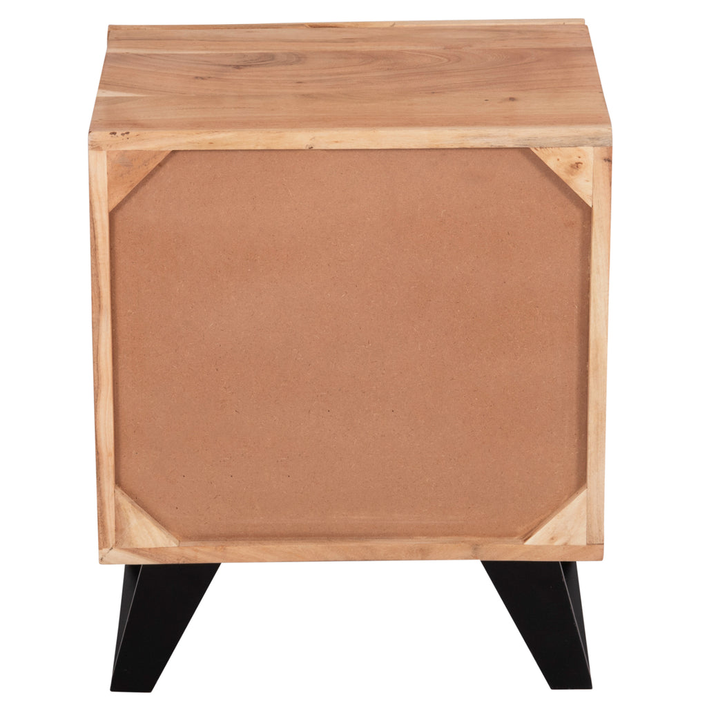 Открийте уникалното ръчно изработено нощно шкафче, изработено от естествен масив акациева дървесина! Като специална характеристика, фронтът на чекмеджето е обработен, за да създаде оригиналния характер и естествено впечатление от резен от огромно дърво. Нощно шкафче, изработено от масивна акациева дървесина в естествен нюанс и метални крака в черно. Разполага с 1 голямо, дълбоко чекмедже за съхранение на вашите вещи. Вечна мебел, която издържа проверката на времето, с отличен завършек, вдъхновен от природата, където дървото играе първата роля. Размери: 45x35x56 см. Забележка: Продуктът е изработен от естествена масивна акациева дървесина и всяка една е уникална поради неравностите на дървесните стволове. Съществуващите пукнатини или тези, които могат да се образуват с течение на времето, се дължат на свиването-разширяването на живия организъм, наречен масивна дървесина, и не представляват производствен дефект, придавайки оригиналност и уникален дизайн на вашето пространство. По време на производствения процес съществуващите пукнатини се униформяват и стабилизират, с материал, изработен от същата дървесина. Следователно, може да има цветови вариации и разлики в размерите на продукта поради размерите на обработената дървесина. Те не представляват дефект на продукта. Продуктът се доставя несглобен във фабрична опаковка.