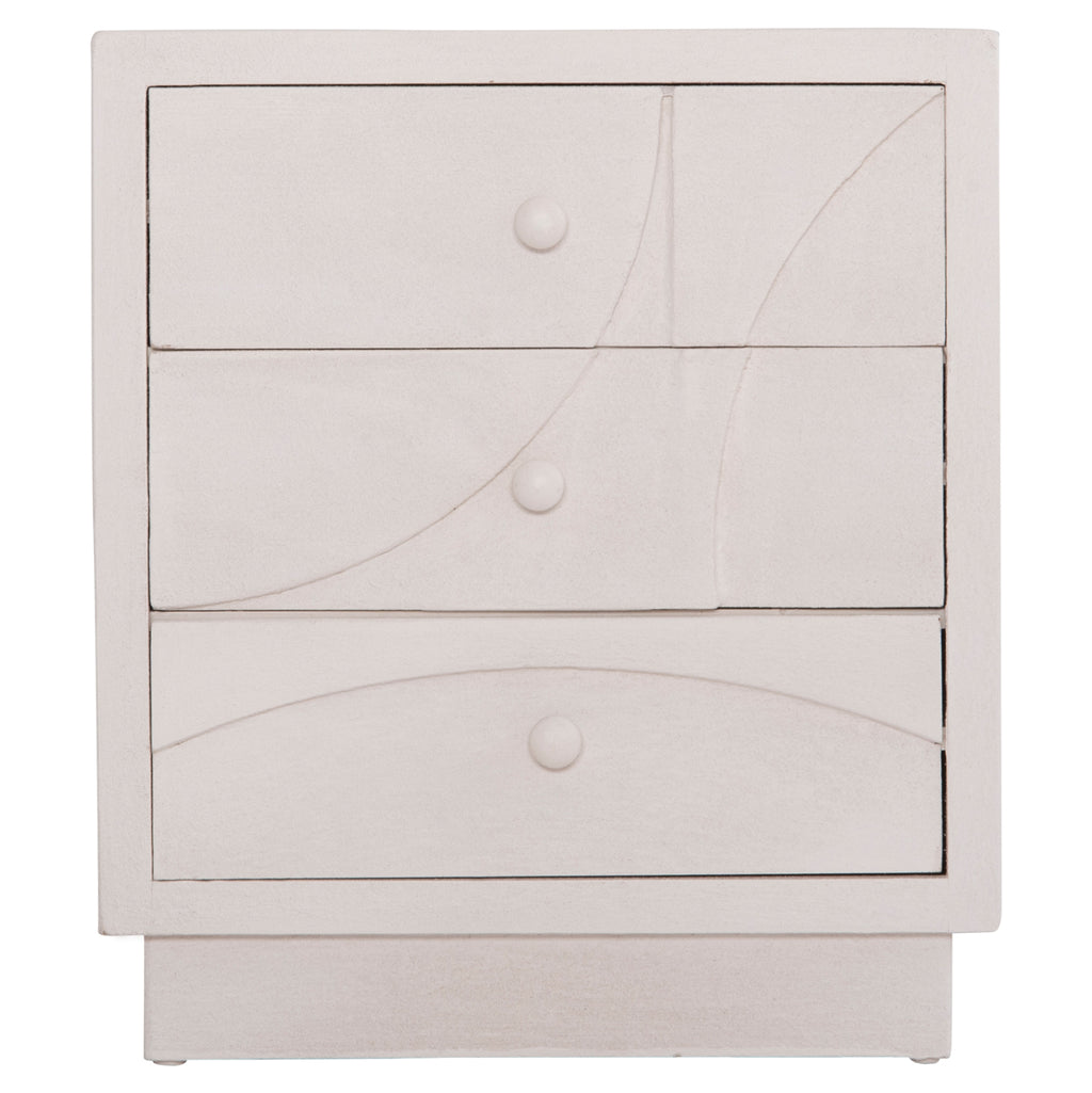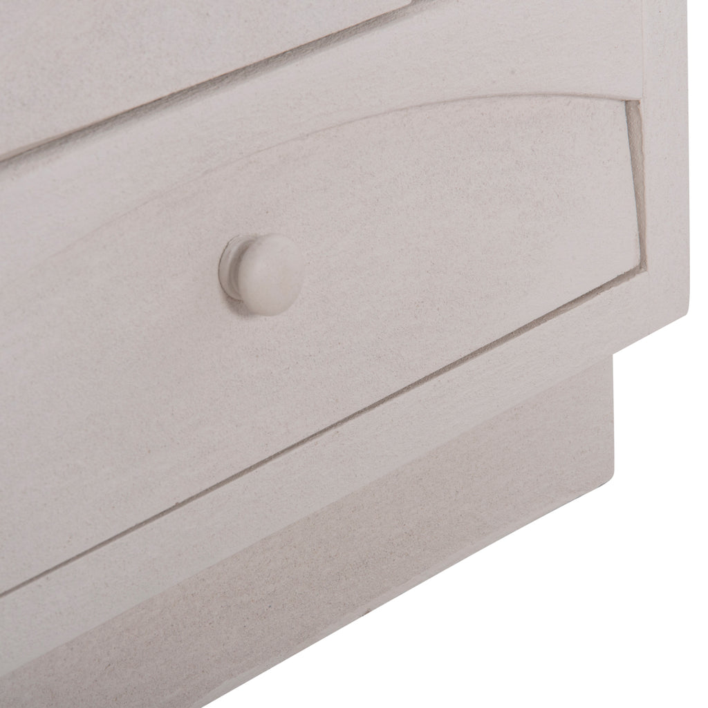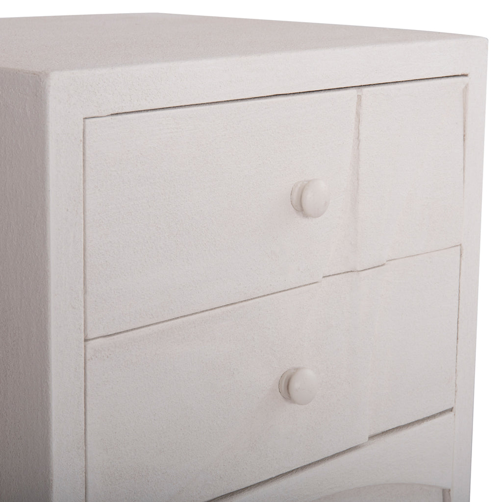 Това ръчно изработено нощно шкафче е изцяло изработено от МДФ в БЕЗБЯЛ цвят с циментова текстура, което е най-модерната тенденция в областта на интериорния дизайн. Разполага с 3 чекмеджета с релефен дизайн, които предлагат достатъчно място, за да поставите всичко, което искате на нощното шкафче. Подходяща за декорация в стил "остров"! РАЗМЕРИ: 43.5-48x38x55.5H cm Чекмедже: 39.5x27.5x19H cm. МАТЕРИАЛИ НА ИЗРАБОТКА: Продуктът е изработен от MDF. MDF (влакна със средна плътност) е модерен материал за масово потребление с основните характеристики на абсорбиране на минимална влага, хомогенност на масата, задоволителни механични свойства, отлична гладкост и много възможности за обработка. ПОДДРЪЖКА: Достатъчно е редовно почистване на прах и забърсване с влажна кърпа, като можете да използвате и меки търговски почистващи препарати. ** Цветопредаването на продукта може леко да се различава от неговото фотографско представяне на вашия екран.