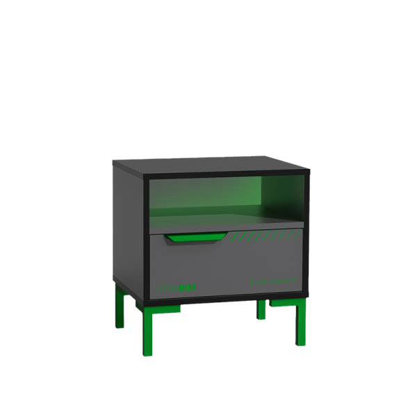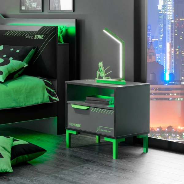 Нощното шкафче TARGON допълва перфектно визията на леглото от същата серия. Със своя футуристичен дизайн, зелени акценти и геймърско излъчване, то придава динамичен и модерен характер на всяка стая. Моделът разполага с отворено пространство за бърз достъп до книги, очила или мобилни устройства, както и практично чекмедже с плавно затваряне, което осигурява тиха и сигурна употреба. Вграденият RGB LED панел с докосване за включване/изключване създава меко осветление в стил „inventory box“ и подчертава тематичния дизайн. Конструкцията е стабилна и изработена от висококачествени материали, а краката с подходяща височина осигуряват лесно почистване с робот-прахосмукачка.