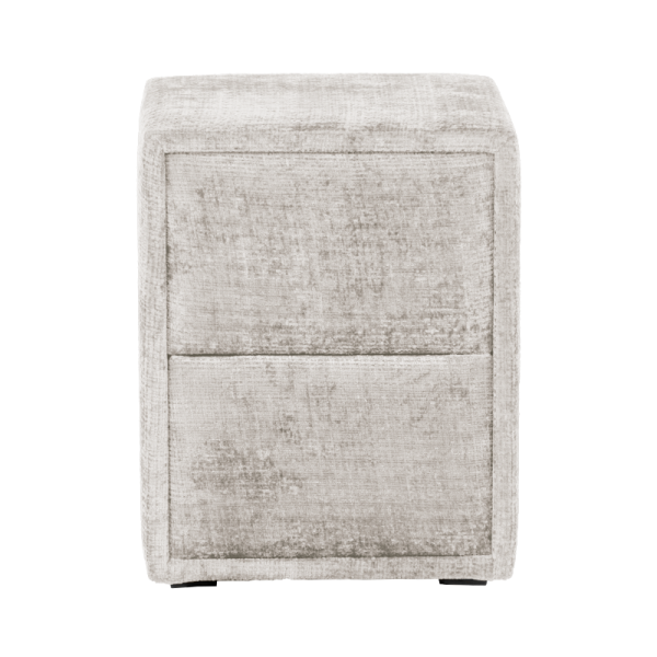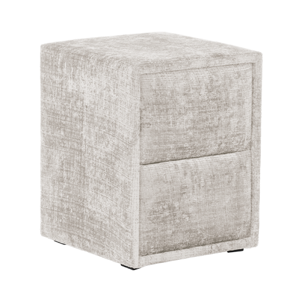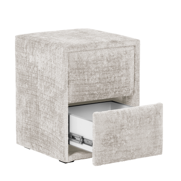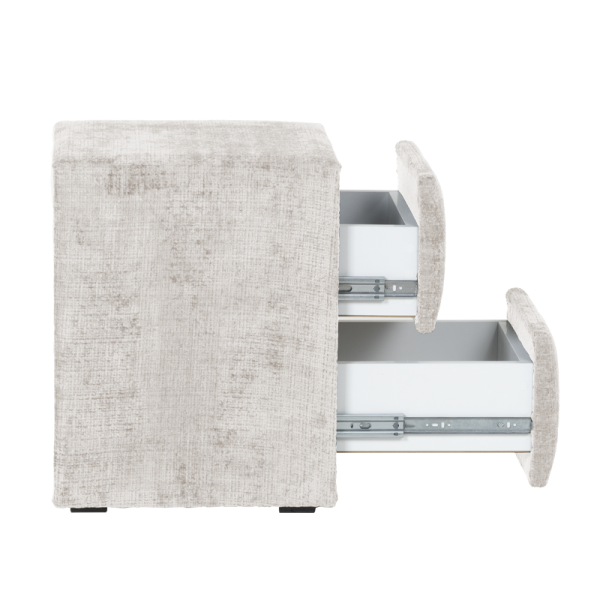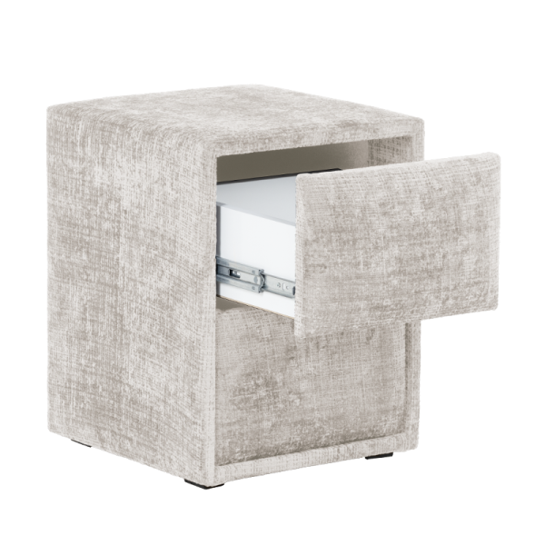 CANCUN е модерно нощно шкафче, което впечатлява със своята изчистена визия и практичен дизайн. Изработено от 18 мм ламинирано ПДЧ и тапицирано с висококачествена дамаска, моделът съчетава визуален комфорт и усещане за уют. Разполага с две чекмеджета с механизъм Push up, които се отварят с лек натиск, осигурявайки лесен достъп и минималистична визия без дръжки. Перфектен избор за модерни спални, в които стилът върви ръка за ръка с функционалността.