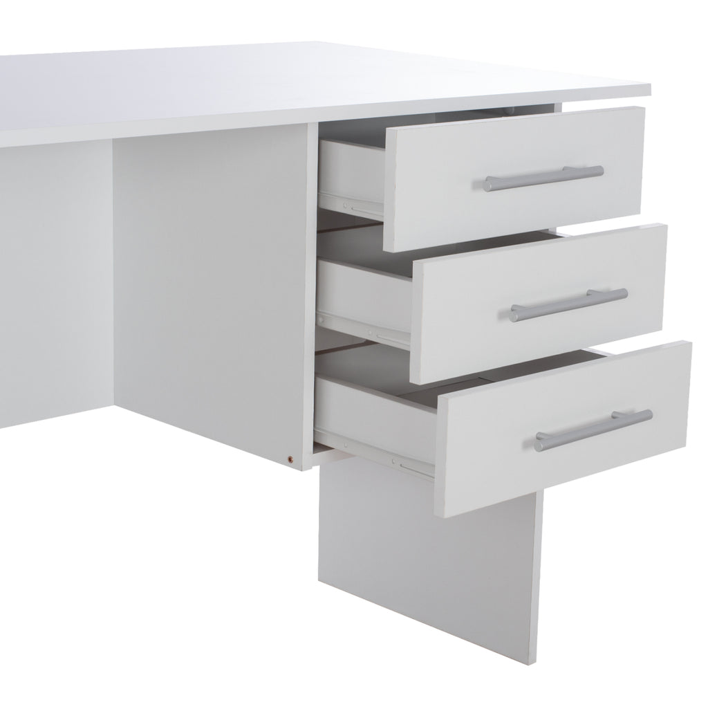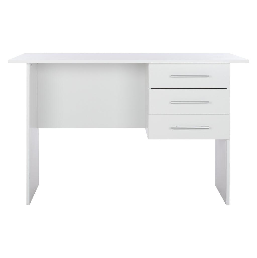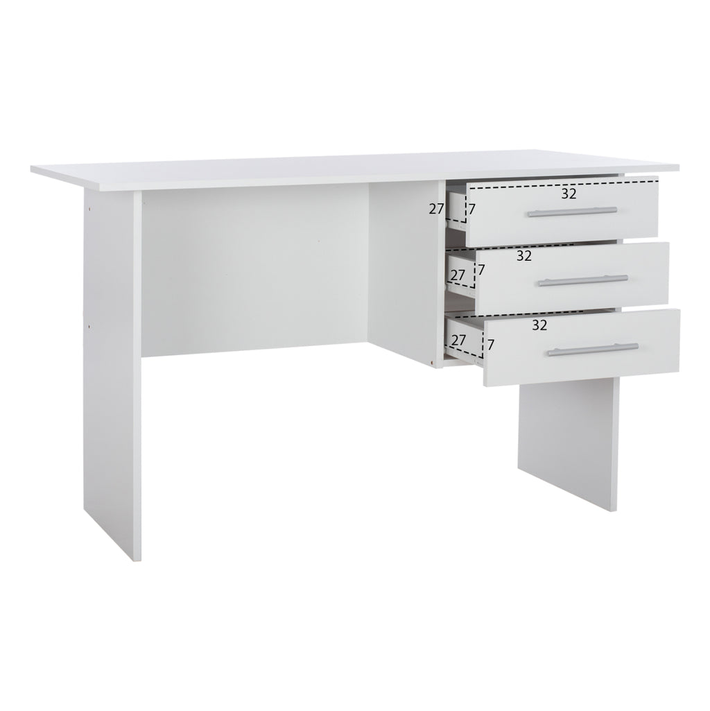 Бюро с елегантен и семпъл дизайн, изработено от издръжлив висококачествен меламин, в бял нюанс. Има много иновативен дизайн, който съчетава естетика с използваемост, предлагайки удобно работно място. Има работна повърхност от бял меламин и три помощни чекмеджета. Размери: 120х60х76 см. Размери на чекмеджето: 32x27x7 см. (x3) Продуктът се предлага разглобен във фабрична опаковка.