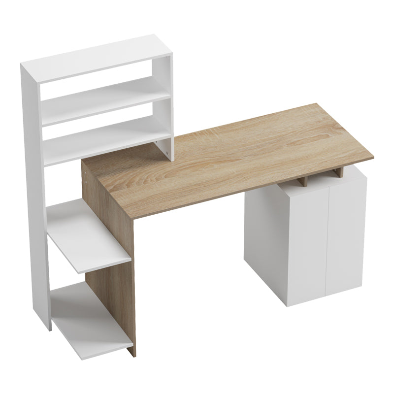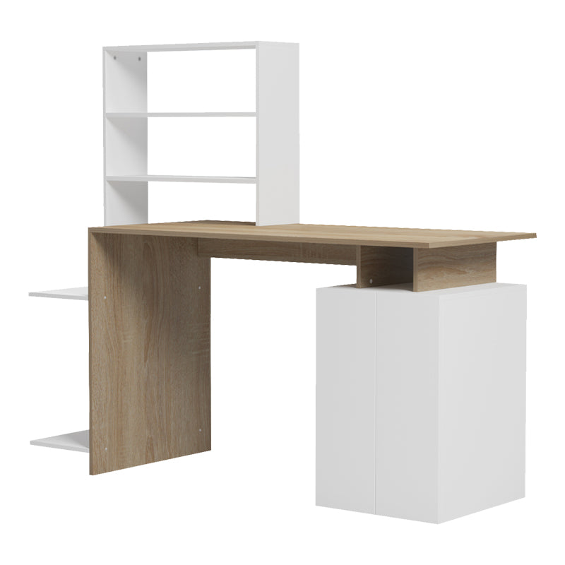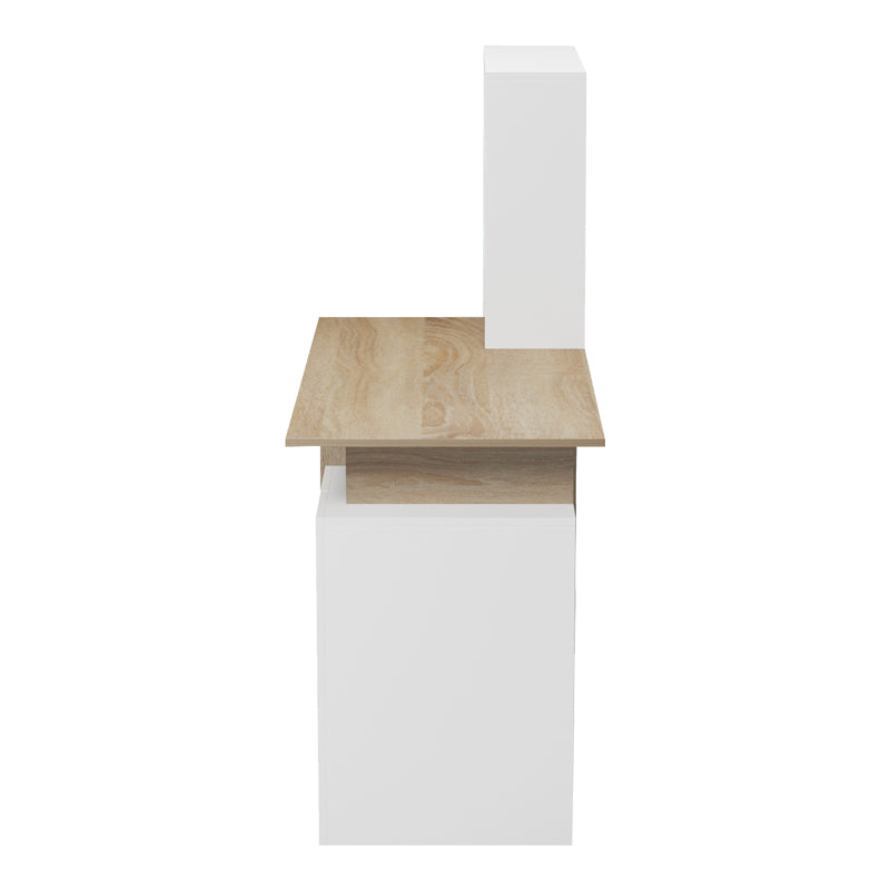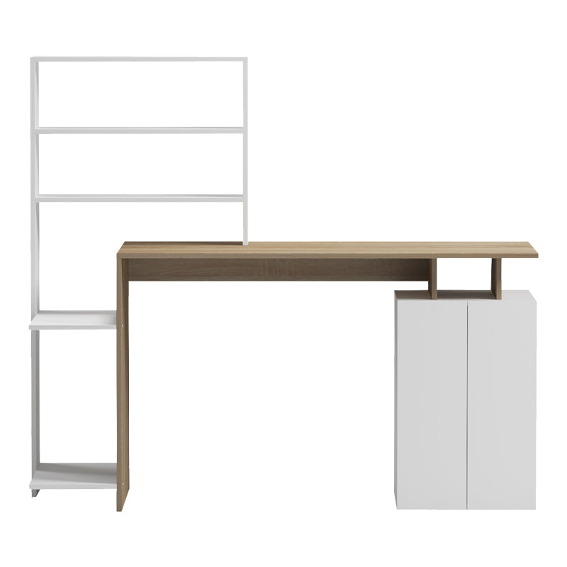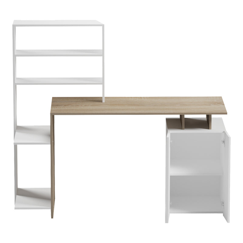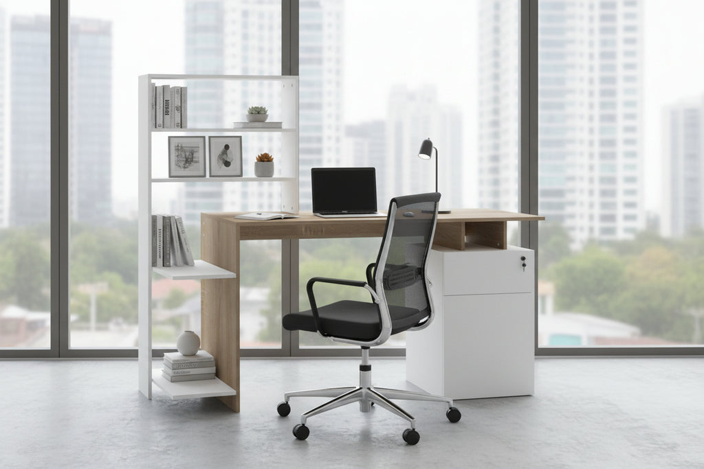 Бюрото Meza съчетава функционалност с модерен дизайн. Разполага с просторна работна повърхност, идеална за компютър, и интегриран рафт за книги, който осигурява достатъчно място за съхранение на книги, декоративни елементи или файлове. Неговият минималистичен дизайн и неутрални цветове го правят лесен за вписване във всяко пространство. Подходящ както за домашна, така и за професионална употреба.