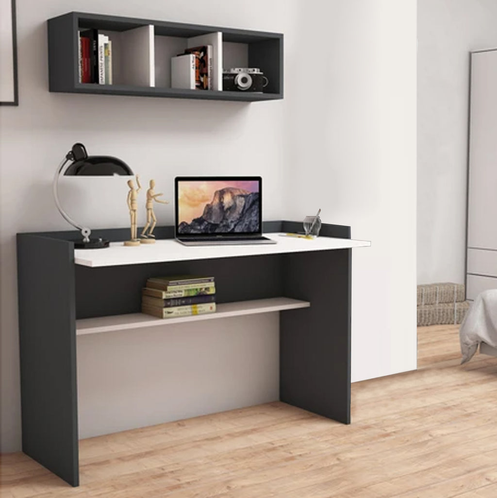 Офис комплект с елегантен и семпъл дизайн, състоящ се от бюро и стенен рафт, изработен от здрав 18 мм висококачествен меламин, в сив нюанс с бели детайли.