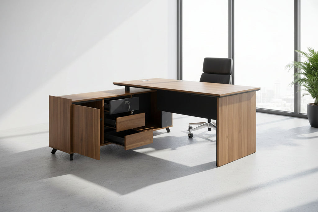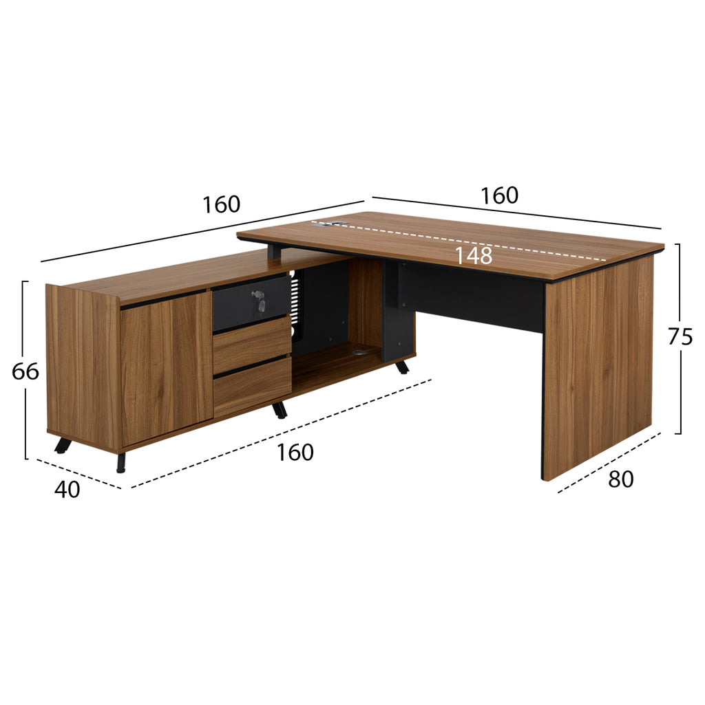 Разполага с шкаф, две прости чекмеджета и едно със заключване и отворено място за съхранение.