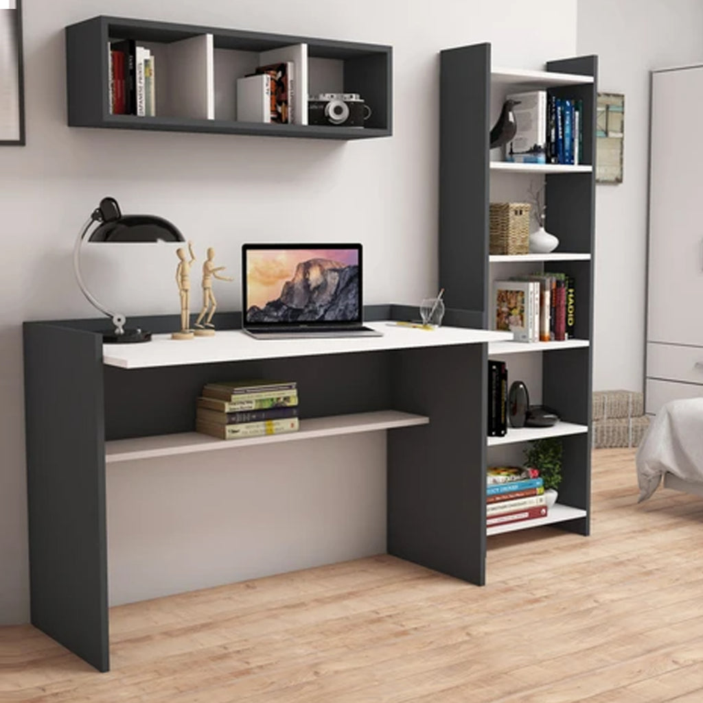 Офис комплект с елегантен и семпъл дизайн, състоящ се от бюро, стенен рафт и библиотека, изработен от здрав 18 мм висококачествен меламин, в сив нюанс с бели детайли. Офис комплект с много иновативен дизайн, който съчетава естетика с използваемост, предлагащ удобно място за работа и съхранение на книги и дребни вещи. - Размери на бюрото: 118х45-58х80см. -Рафт за стена Размери: 90х22х25.6см. Размери на рафтовете: 27.6x22x25.6 см. (x3) -Размери на библиотеката: 48.6x22x160 см. Размери на рафтовете: 48.6x22x27.8 см. Продуктът се предлага разглобен във фабрична опаковка.