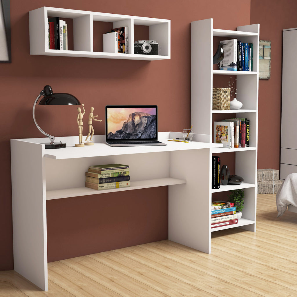 Офис комплект с елегантен и семпъл дизайн, състоящ се от бюро, стенен рафт и библиотека, изработени от издръжлив висококачествен меламин с дебелина 18 мм, в бял нюанс. Офис комплект с много иновативен дизайн, който съчетава естетика с използваемост, предлагащ удобно място за работа и съхранение на книги и дребни вещи. - Размери на бюрото: 118х45-58х80см. -Рафт за стена Размери: 90х22х25.6см. Размери на рафтовете: 27.6x22x25.6 см. (x3) -Размери на библиотеката: 48.6x22x160 см. Размери на рафтовете: 48.6x22x27.8 см. Продуктът се предлага разглобен във фабрична опаковка.