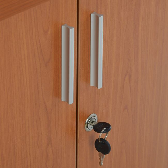 Офис шкаф за професионална употреба, изработен от здрав меламин в черешов нюанс с две врати, ключалка и вътрешен рафт, за съхранение на документи и ежедневните дребни предмети на вашия офис. Размери: 60х46х75см. Забележки: Продуктът се доставя в несглобен вид, във фабрична опаковка.