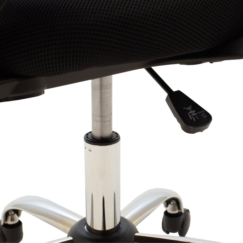 - Облегалката е тапицирана с издръжлива перфорирана мрежа/плат, а седалката с мрежест плат, който позволява циркулация на въздуха и предотвратява изпотяването.