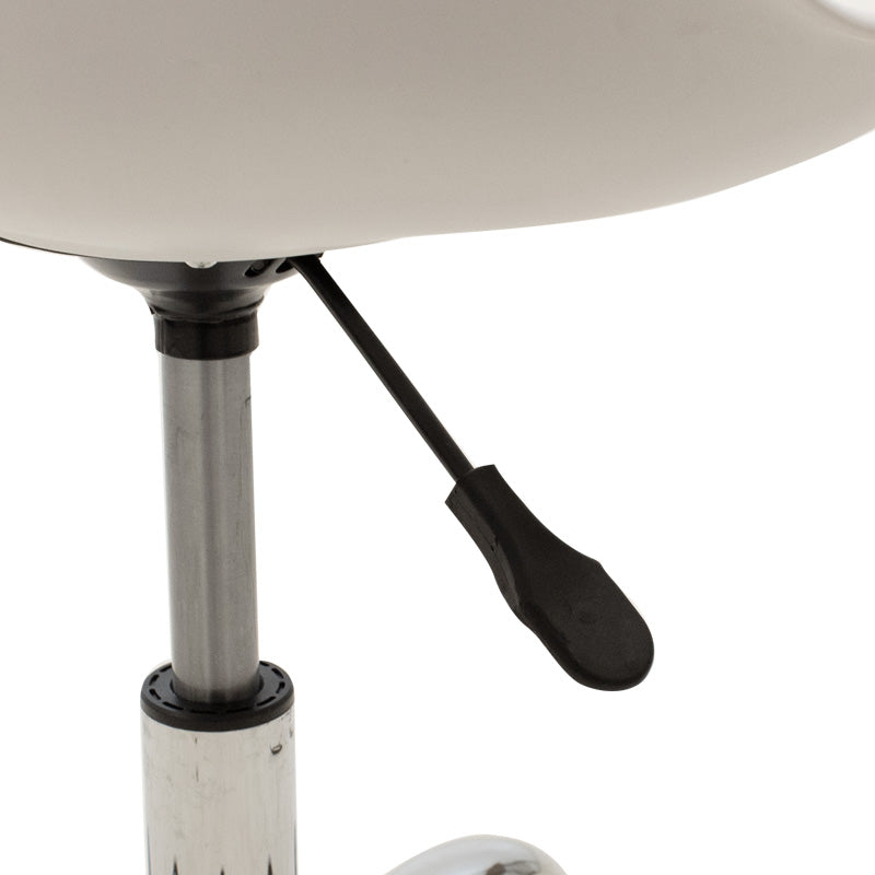 Седалката е тапицирана с висококачествена бяла PU синтетична кожа (технодерма), която придава изтънчен и чист вид. Материалът е лесен за почистване, не попива течности и запазва мекотата си с времето. Освен това е екологичен и издръжлив при ежедневна употреба.