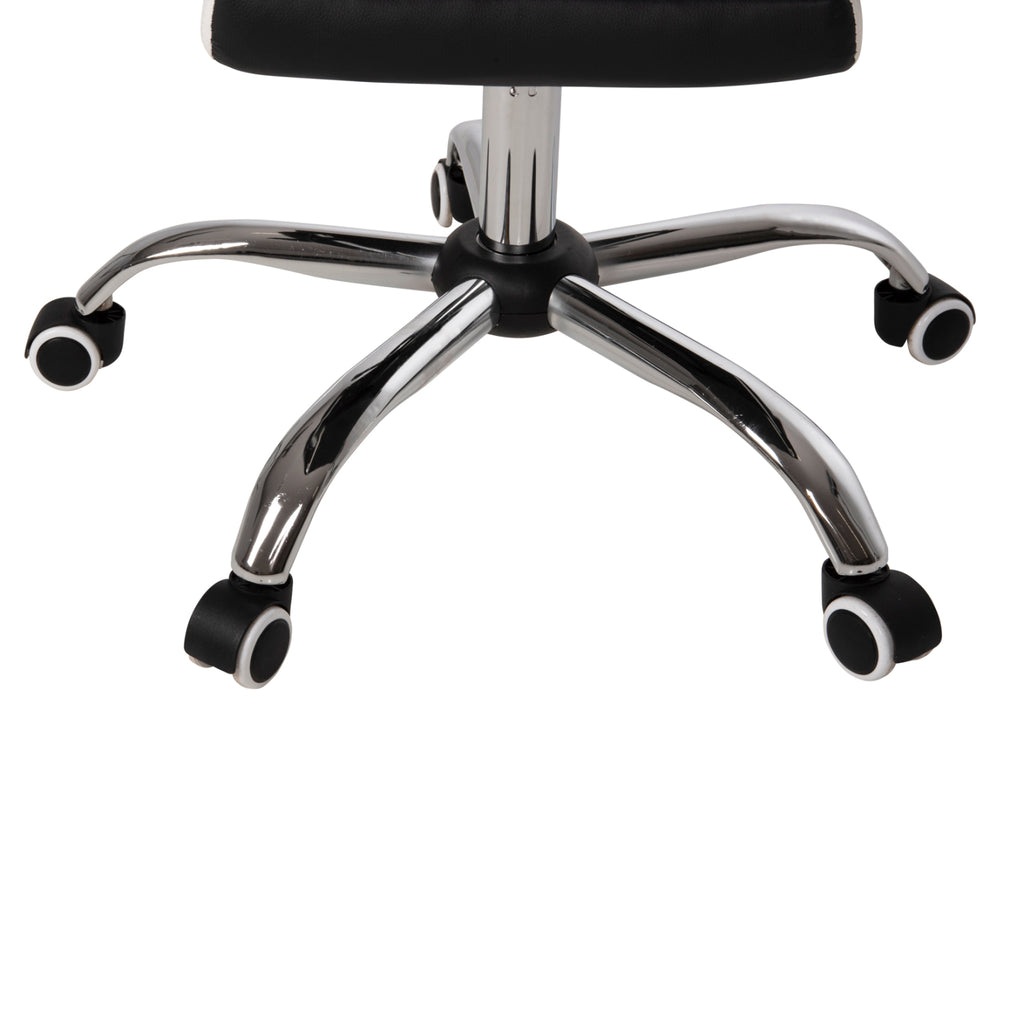 Основата е хромирана и стабилна, с пет лъча във формата на звезда. Колелцата са от подсилен полипропилен, осигуряващи тиха работа и защита на пода. Газовият амортисьор издържа натоварване до 110 кг и позволява плавно регулиране на височината.