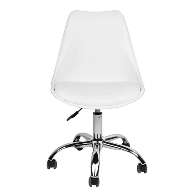Седалката и облегалката са изработени от формован полипропилен, който предлага гъвкавост и анатомична опора за гърба. Вградената възглавница, тапицирана с PU изкуствена кожа, осигурява мекота и удобство при продължителна употреба. Хромираната метална основа с амортисьор гарантира стабилност и товароносимост до 70 кг, а колелцата от полиуретан се движат плавно и безшумно, предпазвайки пода от надрасквания.