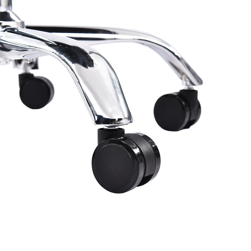 Металната рамка е монтирана върху петоъгълна извита основа с хромирани колела, които осигуряват стабилност и плавно движение във всички посоки. Столът е оборудван с подсилена бутилка за поддръжка, гарантираща дълготрайна надеждност.