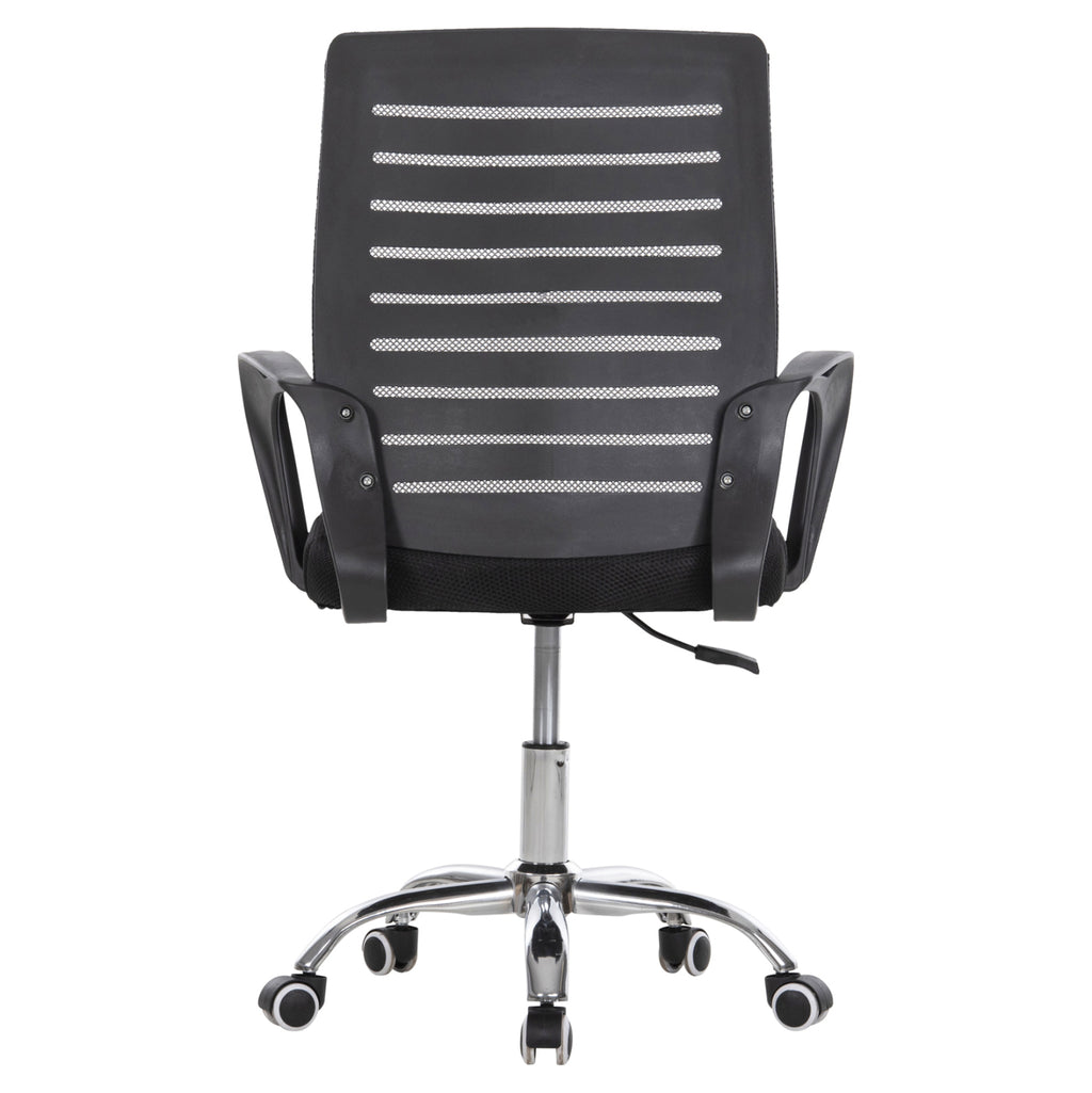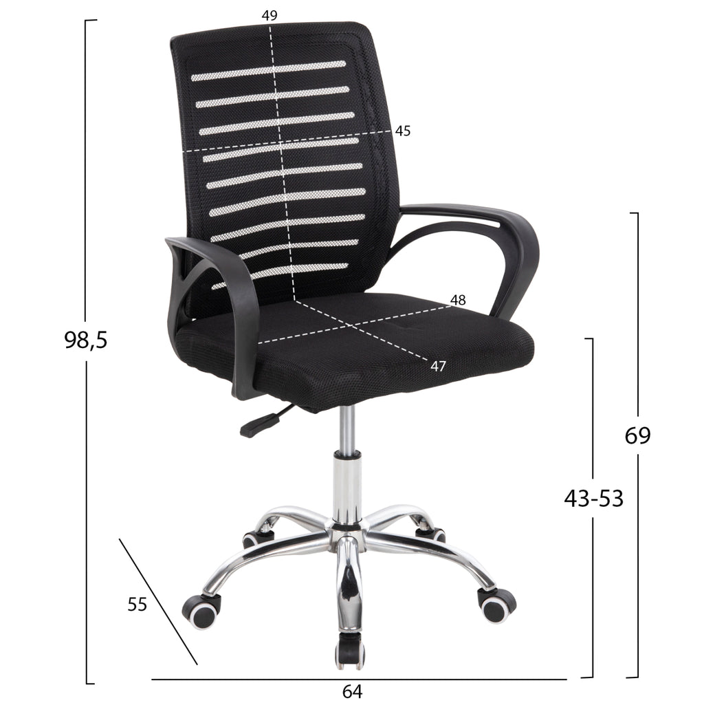 Офис стол в ЧЕРЕН цвят с ХРОМИРАНА метална основа ще ви очарова. Има средно висока анатомична облегалка с полипропиленова рамка и мрежеста материя, удобна седалка с мрежеста материя, полипропиленови рамена и механизъм за окачване с регулиране на наклона. Предложение, което ще задоволи простия потребител, който не се нуждае от сложни настройки на стола си.