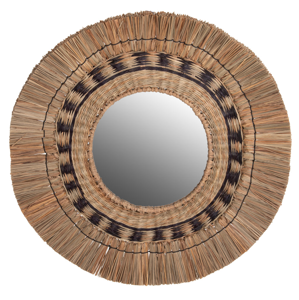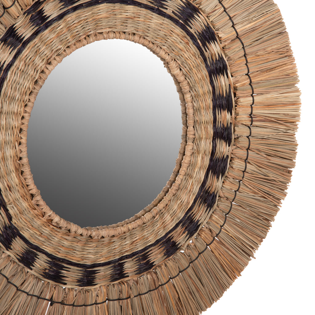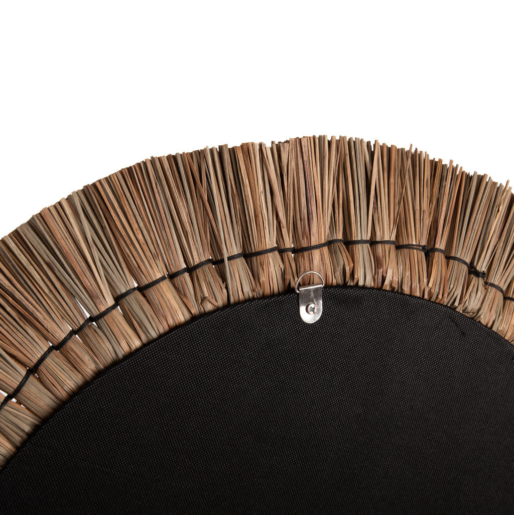 Огледалото КГ7834 е наистина впечатляващо парче в декорацията на вашето пространство! Дизайнът му е уникален с тревна рамка Mendong, която в центъра си "приютява" огледалото, като е в НАТУРАЛЕН цвят с ЧЕРНИ детайли. Характерното е, че огледалото е малко и е предимно декоративен елемент. РАЗМЕРИ: Φ70 см. Разстояние от стената: 3см. МАТЕРИАЛИ ЗА ИЗРАБОТКА: Освен огледалото, което и без това е малко, рамката на огледалото, която също е доминиращият елемент, е направена от специално обработени парчета Mendong Grass. Mendong е вид водна трева, която расте изобилно в Ява, Индонезия. Mendong се използва като суровина за различни артикули като кошници, тави и т.н. Тази трева се добива от обществени насаждения, които не се нуждаят от поливане. Вирее естествено без нужда от допълнителни торове или други пестициди. ПОДДРЪЖКА: Необходимо е само почистване от прах и при необходимост почистване с влажна кърпа. ПРЕДИМСТВА: Огледалото е впечатляващо на външен вид и пленява всеки, който го погледне. Идеален е за дома, но също така и за професионални пространства като хотели, Airbnb, зони за хранене като декоративен елемент и др.