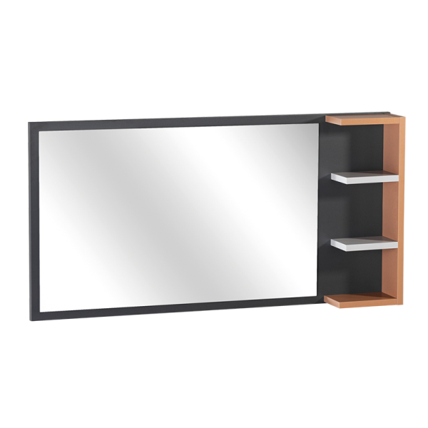 Огледалото BREDA за стена е перфектната комбинация от стил и функционалност, създадено за модерни и динамични интериори. Със своята елегантна правоъгълна форма и изчистена графитена рамка, това огледало добавя съвременно излъчване към всяка стая. Допълнено с три практични рафта от дясната страна, то осигурява допълнително място за съхранение на малки предмети, козметика или аксесоари, като същевременно допринася за по-добра организация. Рафтовете са в светли тонове, които създават визуален контраст с графитената рамка и придават елегантност и стил. Огледалото BREDA не е просто отражение, а акцент, който добавя дълбочина и характер на пространството ви.