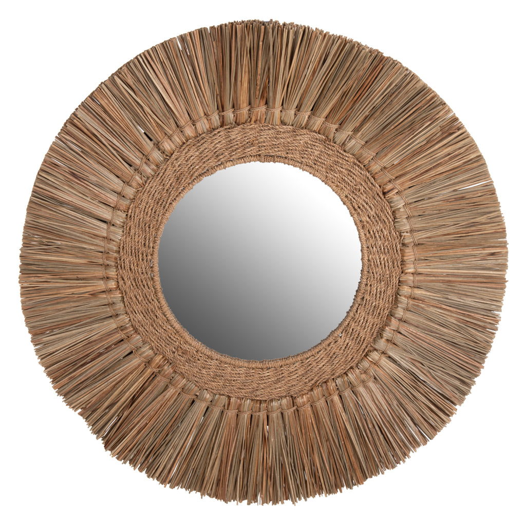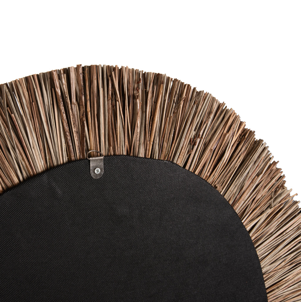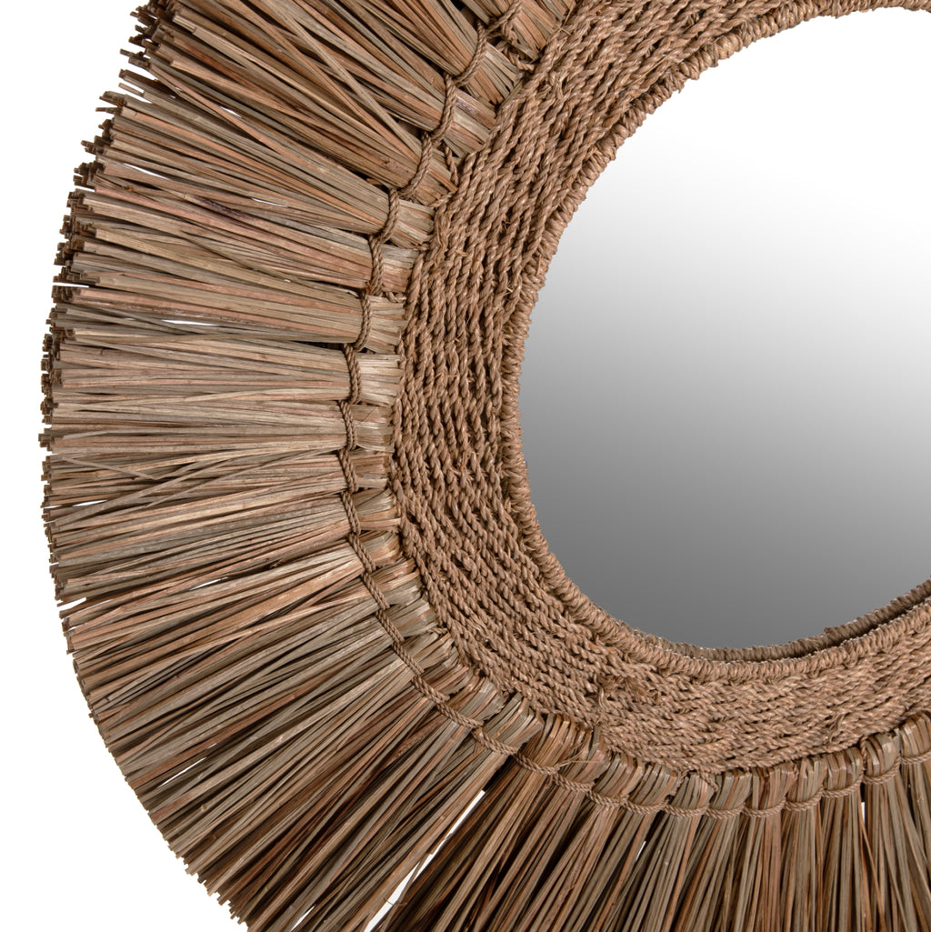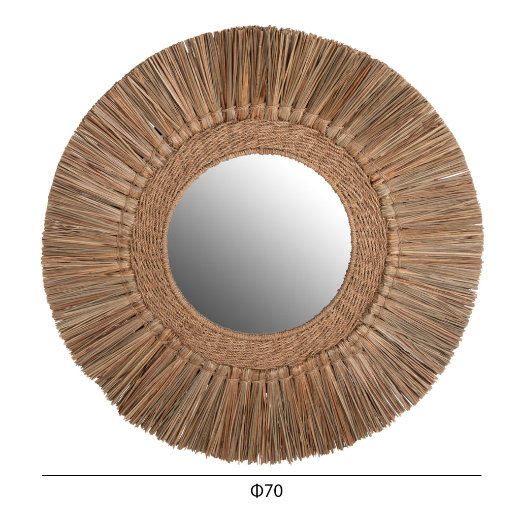 Огледалото MH7831 е наистина впечатляващо парче в декорацията на вашето пространство! Дизайнът му е красив с рамка от мендонг трева, която в центъра си "приютява" огледалото, като то е в естествен цвят. Характерното е, че огледалото е малко и е предимно декоративен елемент. РАЗМЕРИ: Φ70 см. Размер на огледалото: Φ30 см. Разстояние от стената: 3см. МАТЕРИАЛИ ЗА ИЗРАБОТКА: Освен огледалото, което и без това е малко, рамката на огледалото, която е доминиращият елемент, е направена от специално обработени парчета Mendong Grass. Mendong е вид водна трева, която расте изобилно в Ява, Индонезия. Mendong се използва като суровина за различни артикули като кошници, тави и т.н. Тази трева се добива от обществени насаждения, които не се нуждаят от поливане. Вирее естествено без нужда от допълнителни торове или други пестициди. ПОДДРЪЖКА: Необходимо е само почистване от прах и при необходимост почистване с влажна кърпа. ПРЕДИМСТВА: Огледалото е впечатляващо на външен вид и пленява всеки, който го погледне. Идеален е за дома, но също така и за професионални пространства като хотели, Airbnb, зони за хранене като декоративен елемент и др.