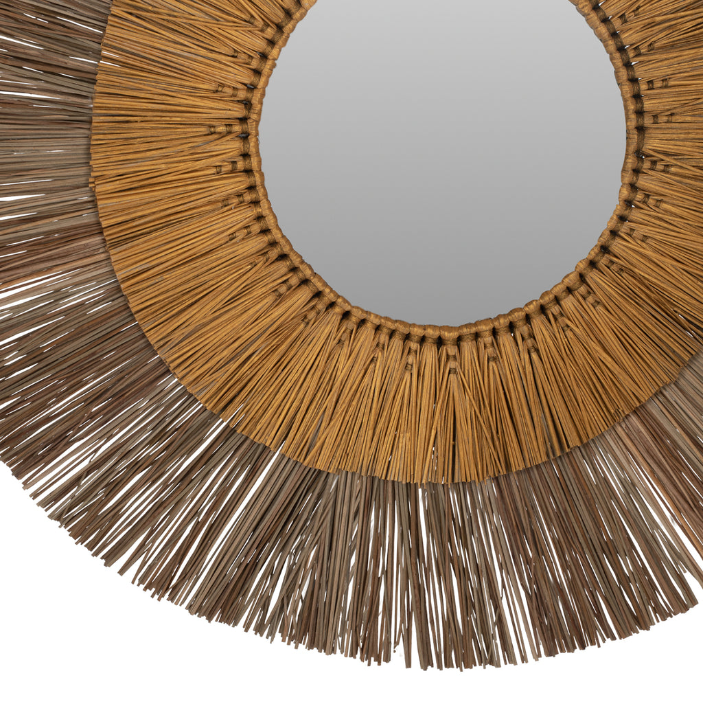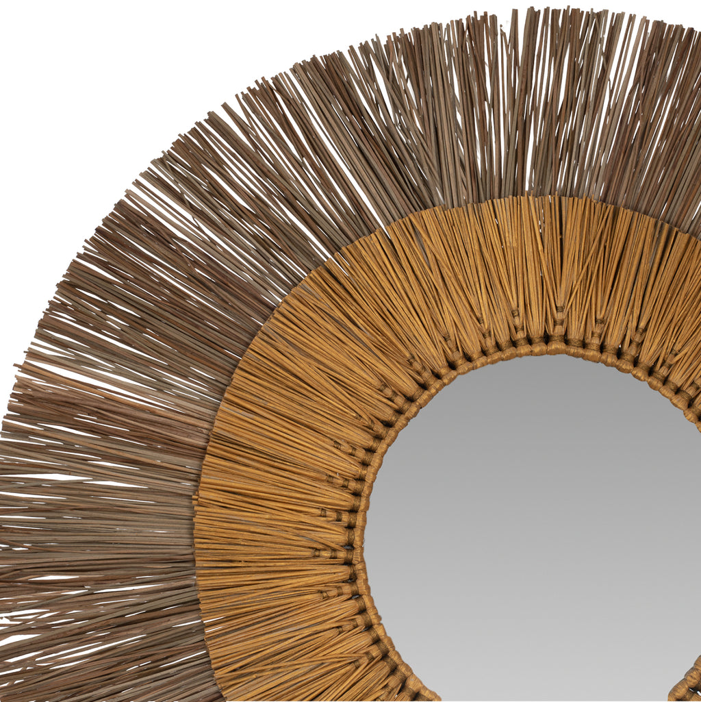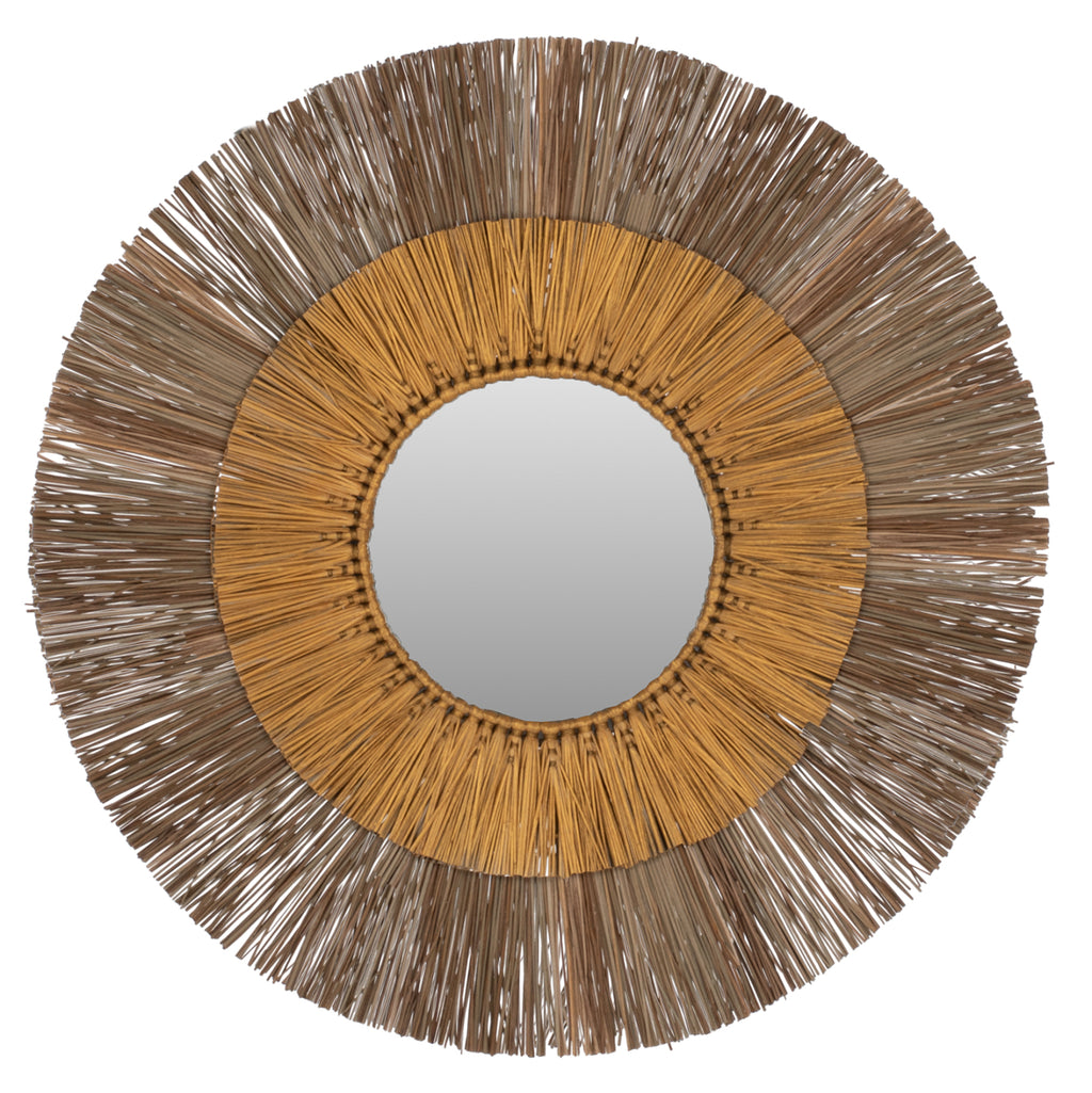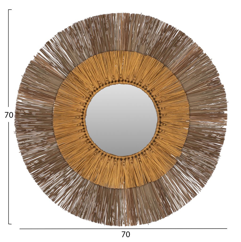 Кръглото огледало MH7800 е наистина впечатляващо парче в декорацията на вашето пространство! Дизайнът му е красив с двойна кръгла рамка от мендонг трева, която в центъра "приютява" огледалото, докато долната рамка е в естествен цвят, а горната е в златен цвят. Характерното е, че огледалото е малко и е предимно декоративен елемент. РАЗМЕРИ: 70x4x70H см. (Φ70см.) Разстояние от стена: 4см. МАТЕРИАЛИ ЗА ИЗРАБОТКА: Освен огледалото, което и без това е малко, рамката на огледалото, която е доминиращият елемент, е направена от специално обработени парчета Mendong Grass. Mendong е вид водна трева, която расте изобилно в Ява, Индонезия. Mendong се използва като суровина за различни артикули като кошници, тави и т.н. Тази трева се добива от обществени насаждения, които не се нуждаят от поливане. Вирее естествено без нужда от допълнителни торове или други пестициди. ПОДДРЪЖКА: Необходимо е само почистване от прах и при необходимост почистване с влажна кърпа. ПРЕДИМСТВА: Огледалото MH7800 е впечатляващо за гледане благодарение на двуцветния си цвят и пленява всеки, който го погледне. Идеален е за дома, но също така и за професионални пространства като хотели, Airbnb, зони за хранене като декоративен елемент и т.н. В крайна сметка естествените материали са новата тенденция в декорацията.