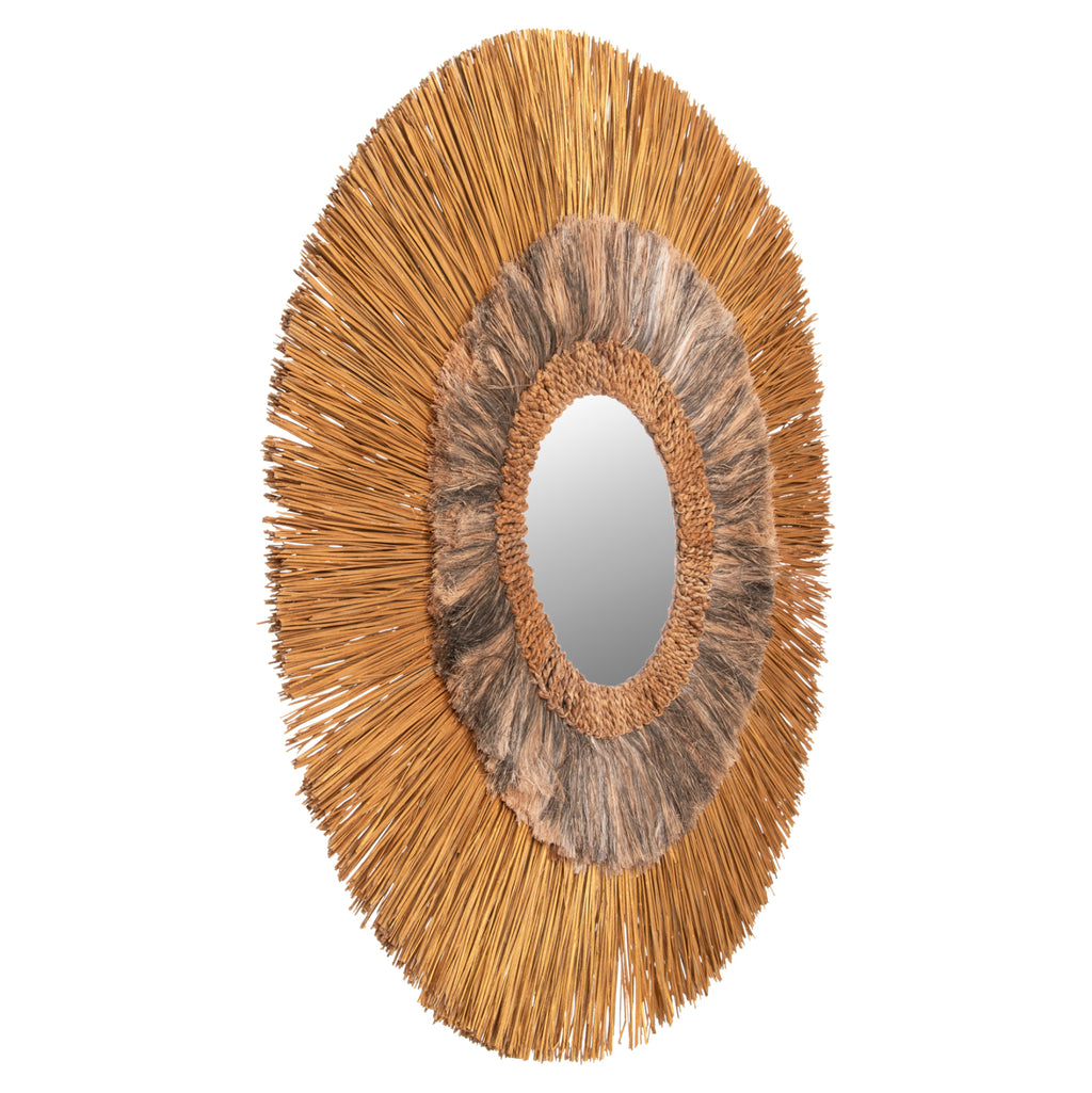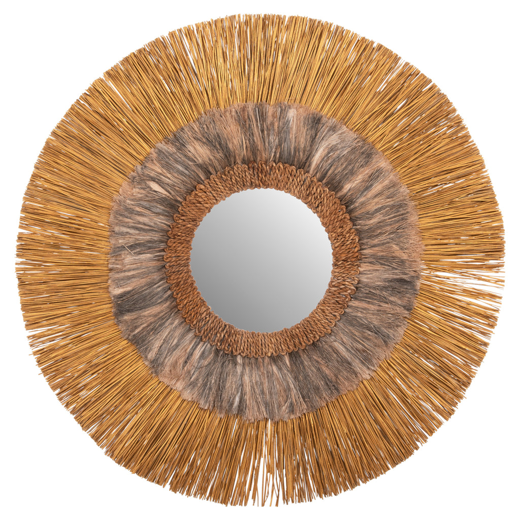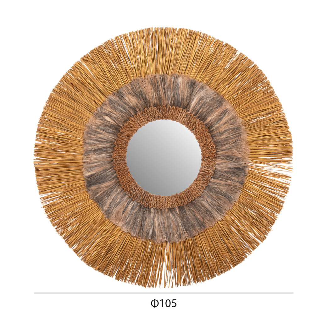 Кръглото огледало ΜΜ7796 е наистина впечатляващо парче в декорацията на вашето пространство! Дизайнът му е красив с рамка от 2 ринга с естествени материали. По-малкият пръстен е изработен от конопени влакна Manila в черен цвят, докато по-големият пръстен е изработен от Mendong Grass в златен цвят. Огледалото в центъра допълва красиво този декоративен централен елемент. РАЗМЕРИ: 105x5x105H см. (Φ105см.) Разстояние от стена: 5см. МАТЕРИАЛИ ЗА ИЗРАБОТКА: В допълнение към огледалото, рамката на огледалото, която е и доминиращият елемент, е изработена от специално обработени парчета Mendong Grass и влакна от абака. Mendong е вид водна трева, която расте изобилно в Ява, Индонезия. Mendong се използва като суровина за различни артикули като кошници, тави и т.н. Тази трева се добива от обществени насаждения, които не се нуждаят от поливане. Вирее естествено без нужда от допълнителни торове или други пестициди. Манилският коноп е вид ярко оцветено влакно, получено от Musa textilis (роднина на ядливите банани), наричано още манилски коноп, както и абака. Абаката е изключително здраво влакно, много скъпо и в пъти по-скъпо от дървесната маса. Името се отнася до столицата на Филипините, един от основните производители на канабис, Манила. Отглеждането на растения абака може да намали ерозията, да увеличи биоразнообразието и да обогати почвата. И накрая, той е устойчив на вода и влага. ПОДДРЪЖКА: Необходимо е само почистване от прах и при необходимост почистване с влажна кърпа. ПРЕДИМСТВА: Огледалото MH7796 е впечатляващо на външен вид и пленява всеки, който го погледне. Идеален е за дома, но също така и за професионални пространства като хотели, Airbnb, зони за хранене като декоративен елемент и др. Освен това, най-новата тенденция в декорацията е използването на естествени и рециклируеми материали!