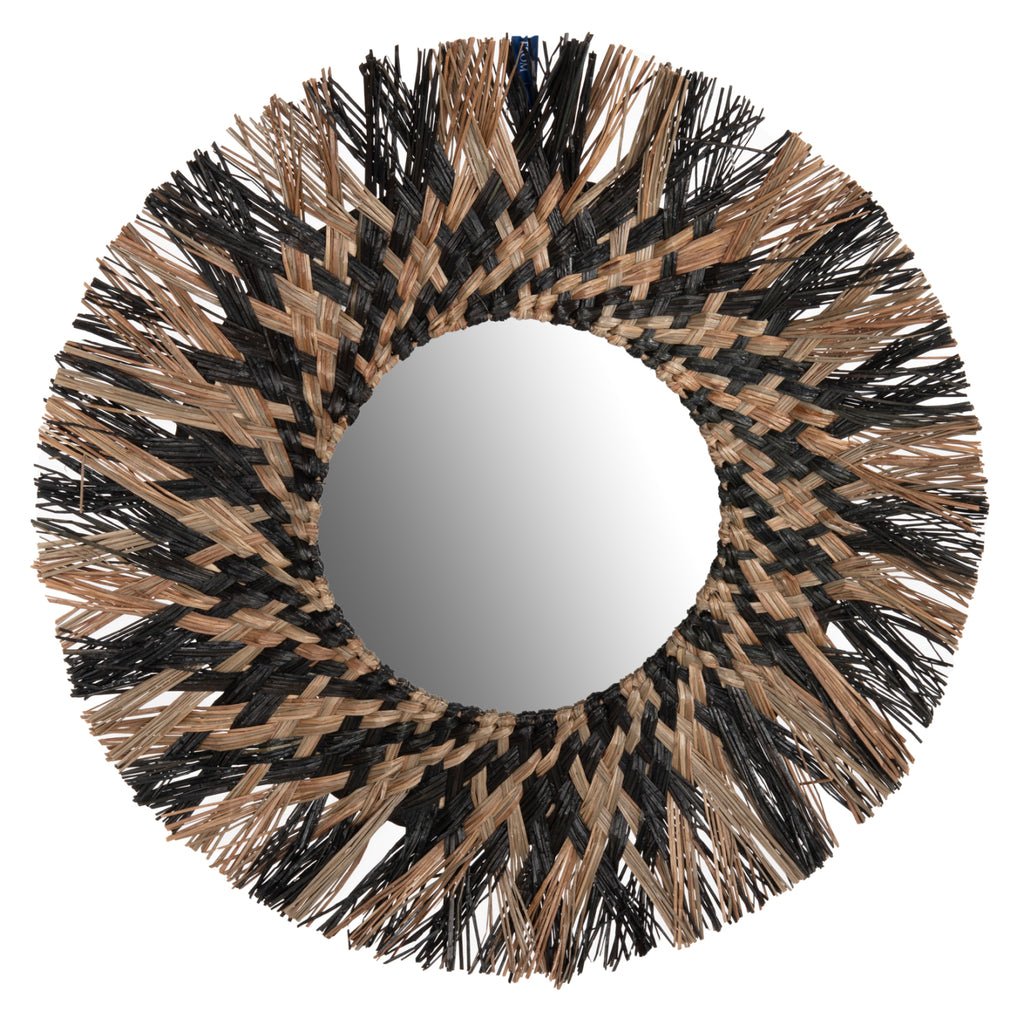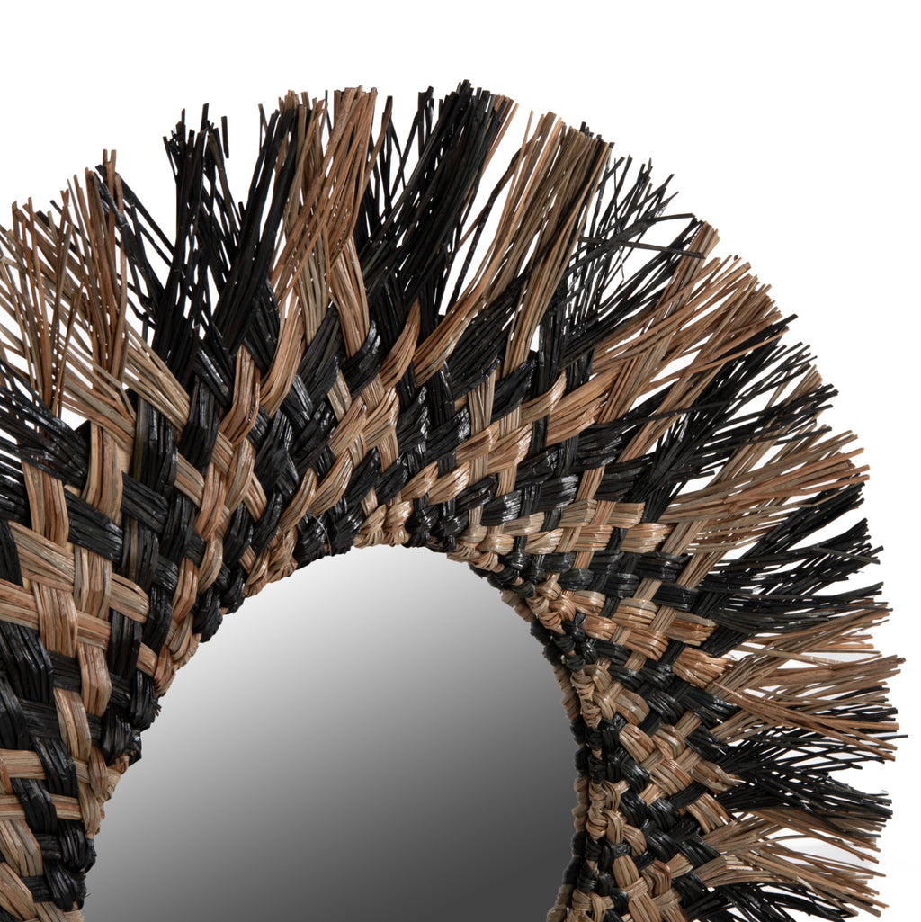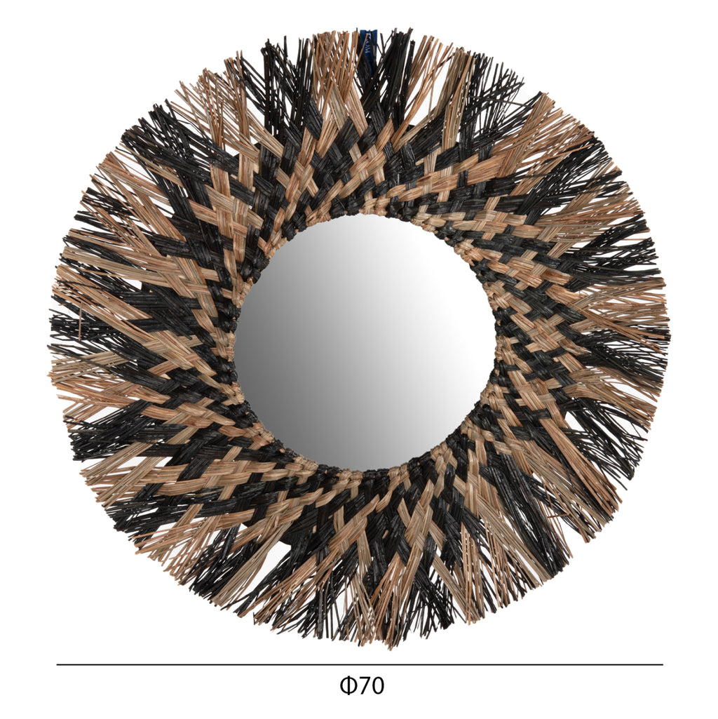 Огледалото MH7833 е наистина впечатляващо парче в декорацията на вашето пространство! Дизайнът му е специален с рамка от плетена мендонг трева, която в центъра си "приютява" огледалото, като е в ЧЕРЕН И НАТУРАЛЕН цвят. Характерното е, че огледалото е малко и е предимно декоративен елемент. РАЗМЕРИ: Φ70 см. Разстояние от стената: 3см. МАТЕРИАЛИ ЗА ИЗРАБОТКА: Освен огледалото, което и без това е малко, рамката на огледалото, която също е доминиращият елемент, е направена от специално обработени парчета Mendong Grass. Mendong е вид водна трева, която расте изобилно в Ява, Индонезия. Mendong се използва като суровина за различни артикули като кошници, тави и т.н. Тази трева се добива от обществени насаждения, които не се нуждаят от поливане. Вирее естествено без нужда от допълнителни торове или други пестициди. ПОДДРЪЖКА: Необходимо е само почистване от прах и при необходимост почистване с влажна кърпа. ПРЕДИМСТВА: Огледалото е впечатляващо на външен вид и пленява всеки, който го погледне. Идеален е за дома, но също така и за професионални пространства като хотели, Airbnb, зони за хранене като декоративен елемент и др.