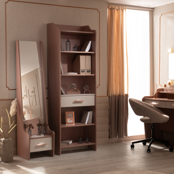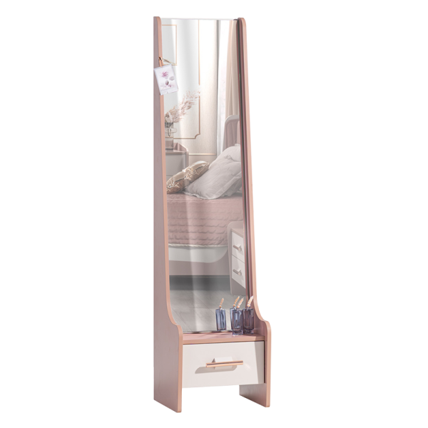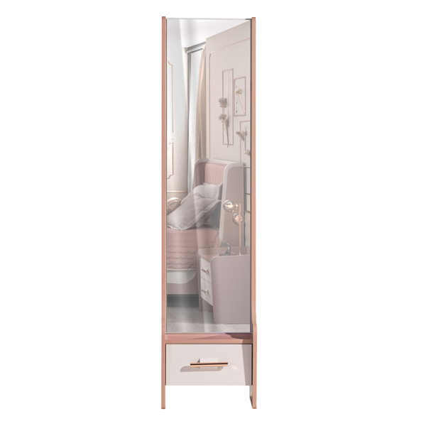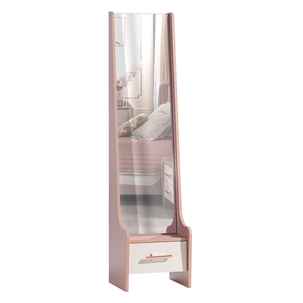 Огледалото ESTELLA съчетава стил и функционалност, като предлага практично решение за съхранение и грижа за визията. С изчистен и елегантен силует, то се вписва чудесно в детски или тийнейджърски интериор. Вграденото чекмедже предоставя дискретно място за съхранение на аксесоари, грим или други лични вещи, а стилната дръжка в розово злато придава фин акцент. Огледалото е изработено от качествени материали, които гарантират дълготрайна и безопасна употреба.