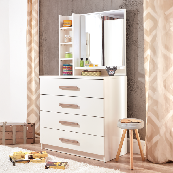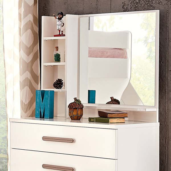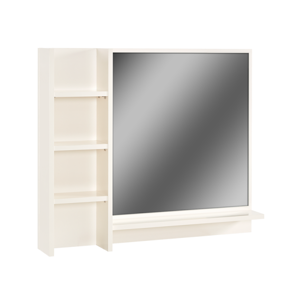 Огледало с етажерка JOYIN – стилен и практичен акцент към детския скрин JOYIN. Изработено от 18 мм ПДЧ с меламиново покритие и флотално стъкло, устойчиво на влага и корозия. Разполага с три функционални рафта за организиране на аксесоари и скрити метални окачвачи за сигурно фиксиране към стената. Създава завършен и хармоничен вид в детското пространство.